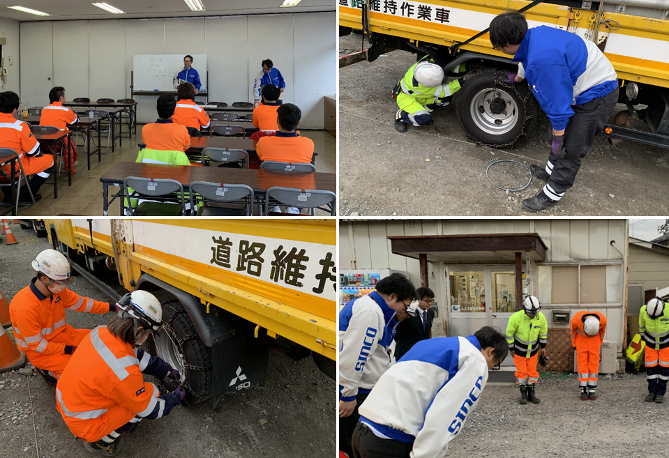 ①~④は座学、⑤⑥は八王子維持営業所の駐車場にてカウントダウンバック誘導とタイヤチェーンの着脱を実践いたしました。⑦終礼では、近頃インフルエンザが流行しているため、予防接種の受診と体調管理の徹底を呼びかけました。