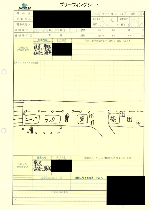 所長パトロール 国道60号線 上り線 左車線規制(名古屋東営業所) ■ブリーフィング内容 ・夜間作業で一般車の速度が速いため正対作業を徹底する。 ・作業中に第三者に接触しないように周囲の確認をする。 ・転倒の恐れがあるので足元の確認をして作業する。 ・運転手の指名、追い出し、注意喚起者の指名。![]()