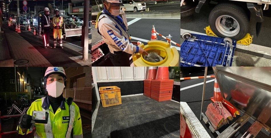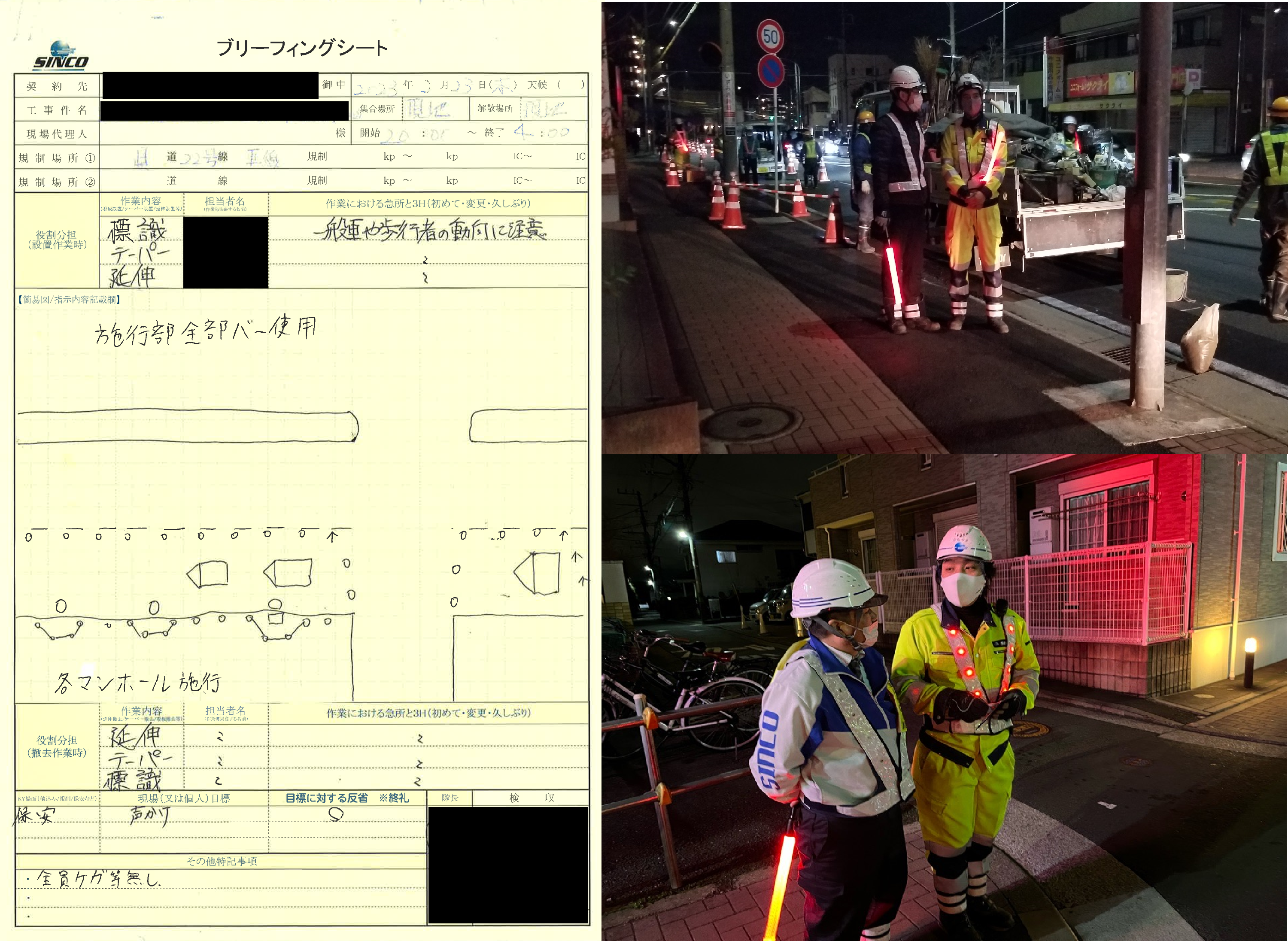 所長パト 県道22号下り線走行車線規制(厚木営業所)ブリーフィング内容 ・本日の規制内容 ・配車指示 ・役割指示 ・現場までのルート確認 ・現場の施工内容と流入車輛の確認 ・現場を出入りする車両とタイミングについて ・歩行者誘導の注意点 ・設置時のテーパー位置の確認 ・設置完了後の流れについて ・飛散防止対策について