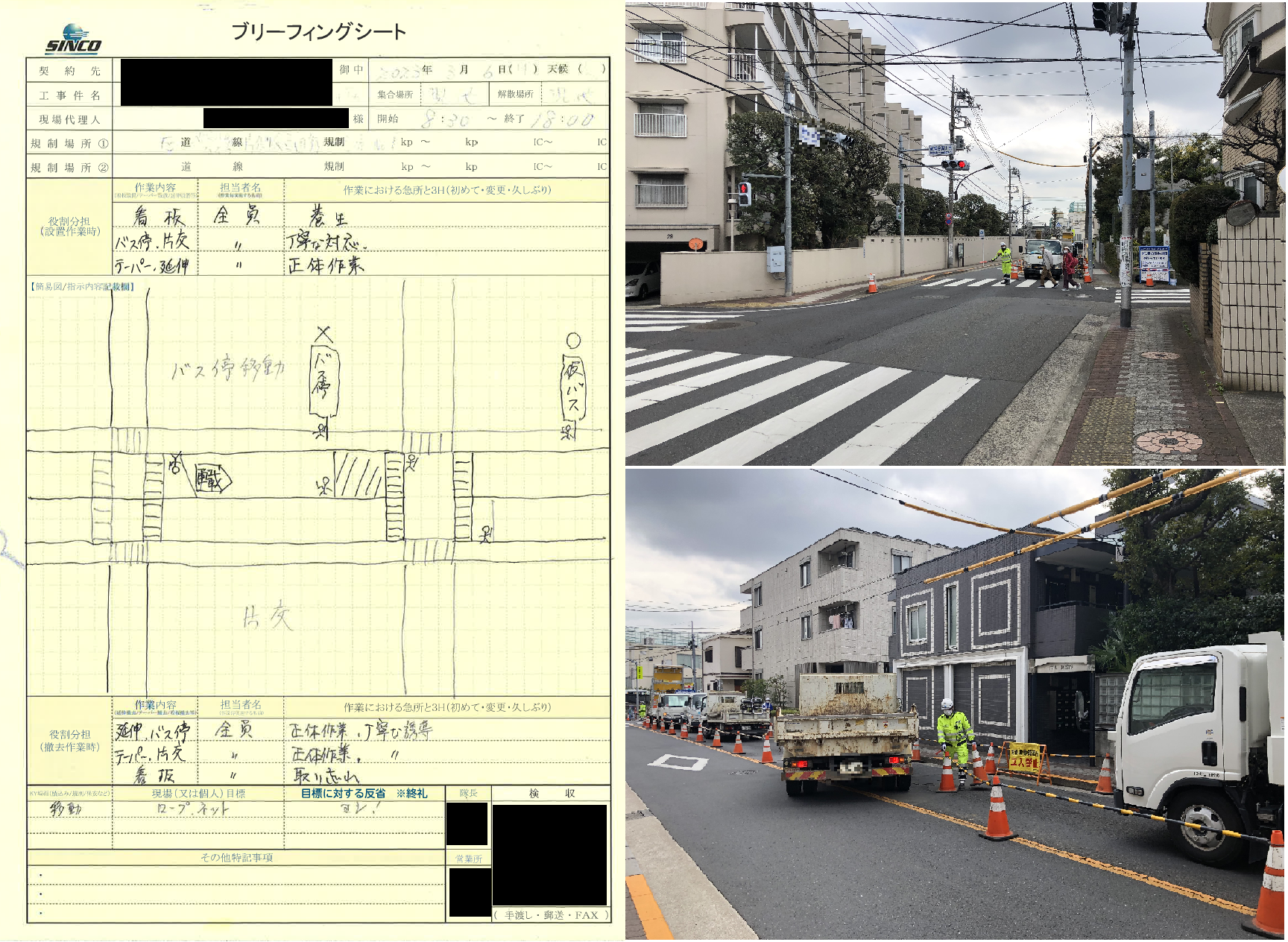 安全パト 荏原病院通り片側交互通行規制(葛西営業所)ブリーフィング内容 ・本日の規制箇所と内容の確認 ・正対作業及び周囲確認の徹底 ・車両停車時の4点セットの徹底