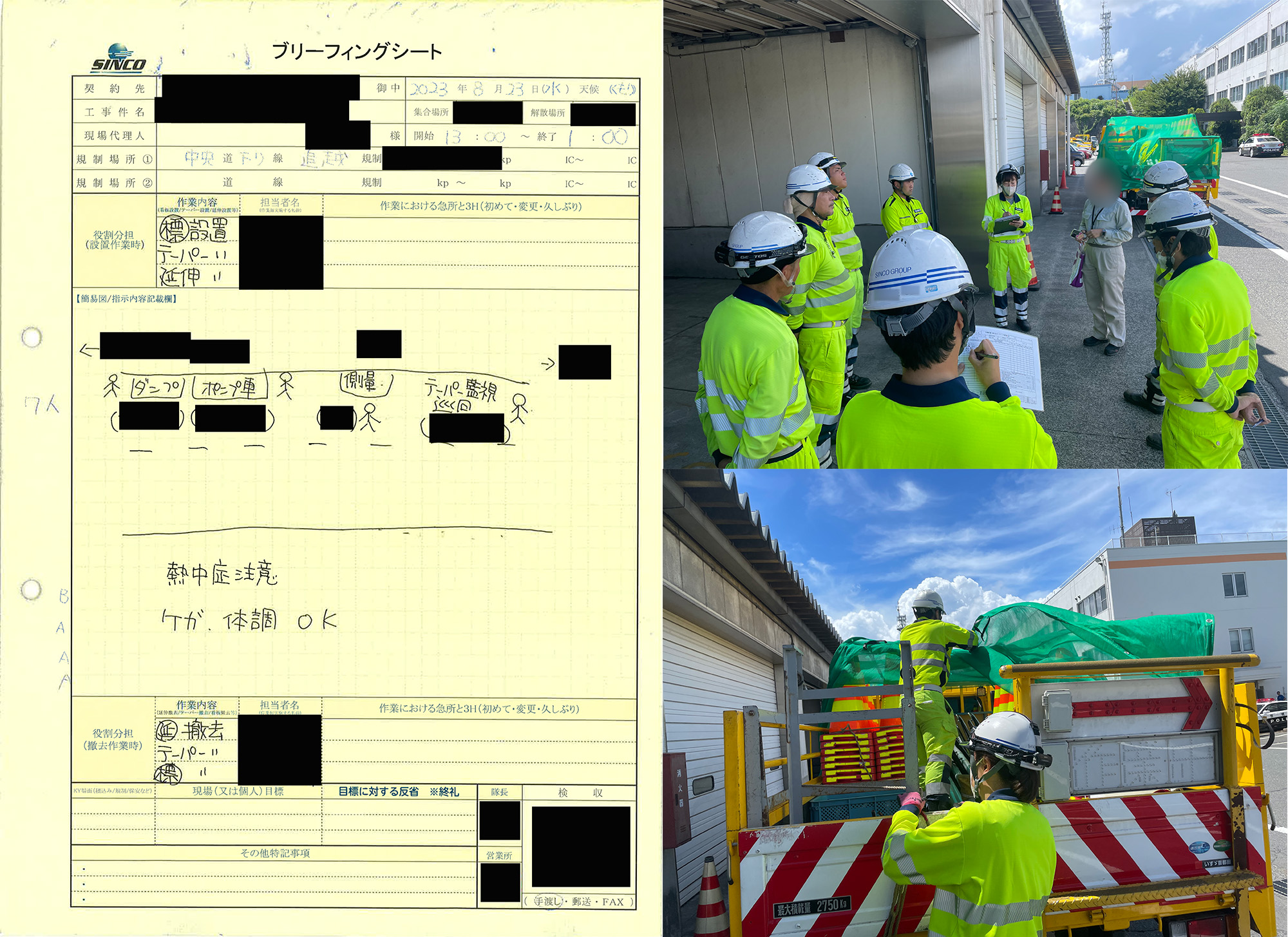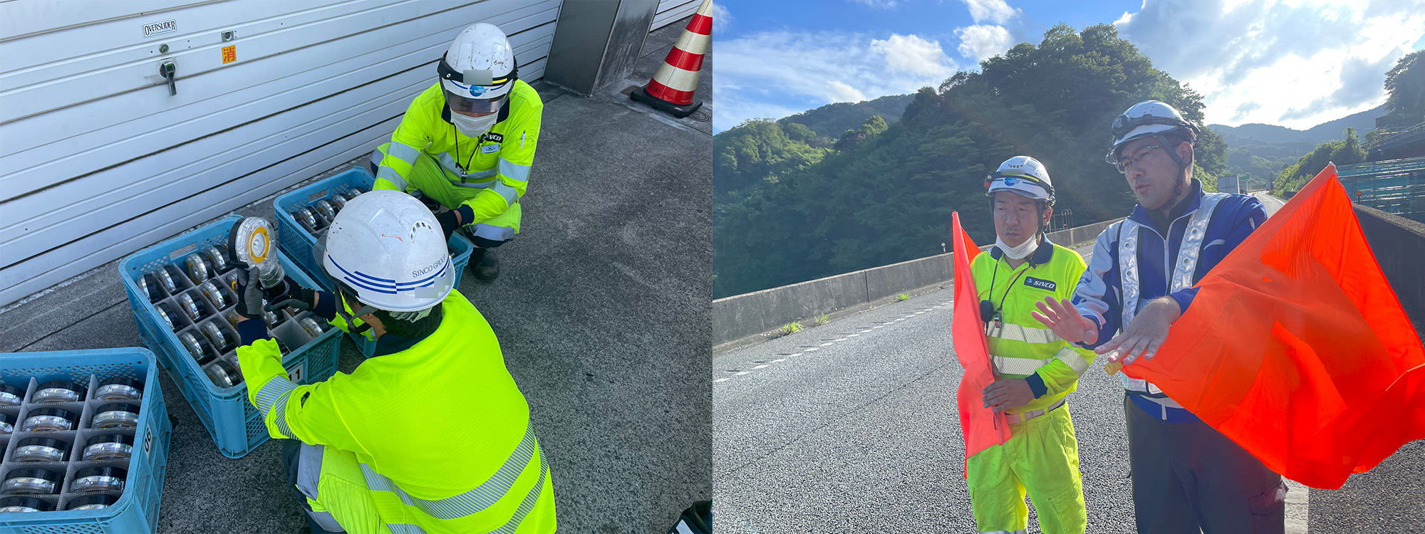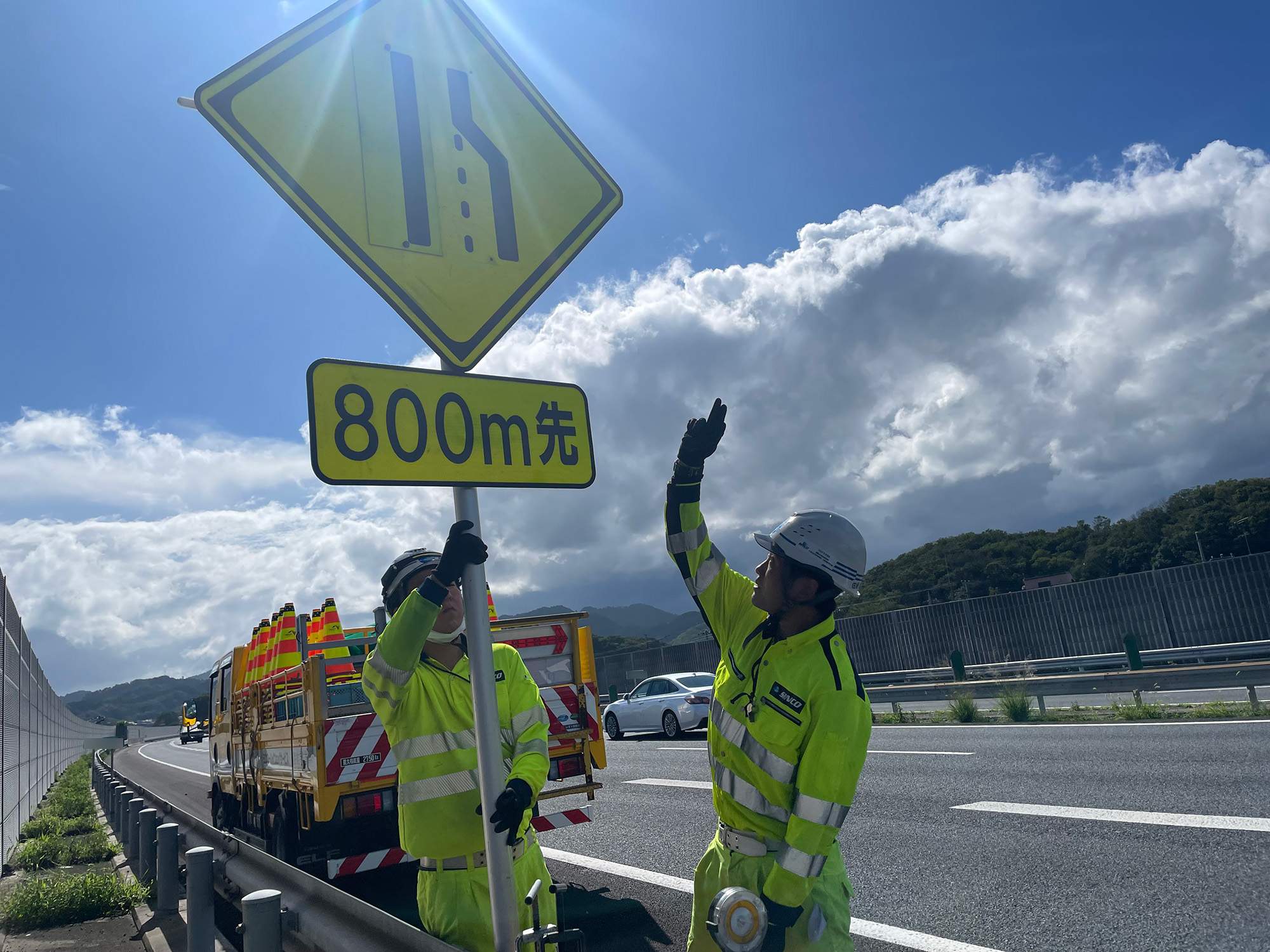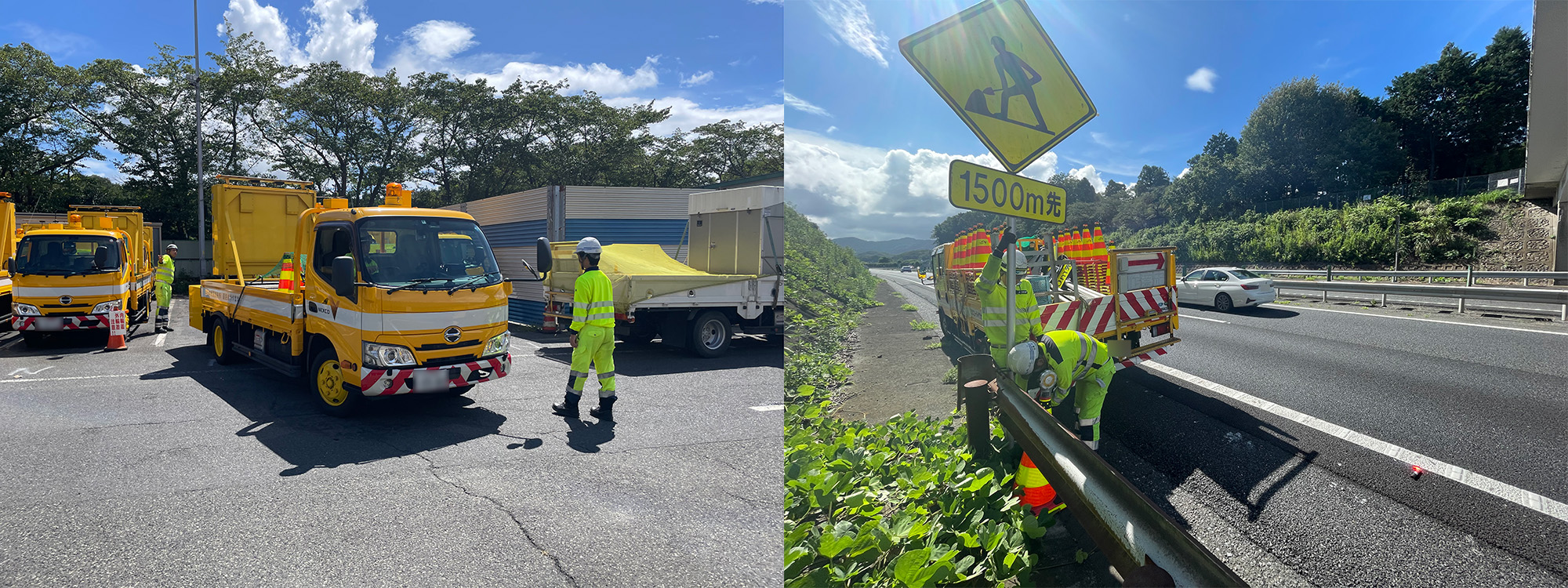規制は交通量が多く標識設置を設置できない状況であり、30分押しでの予備標識設置となりました。 隊員さん方には焦る必要は無く手順通りに規制を設置することを周知。 ブリーフィングでも隊長さんから話があった 『工事関係車両も大事だが第一に考えるべきは一般車である』という事を理解し、 全員がその意識をもって一般車への配慮が出来ていたと感じています。