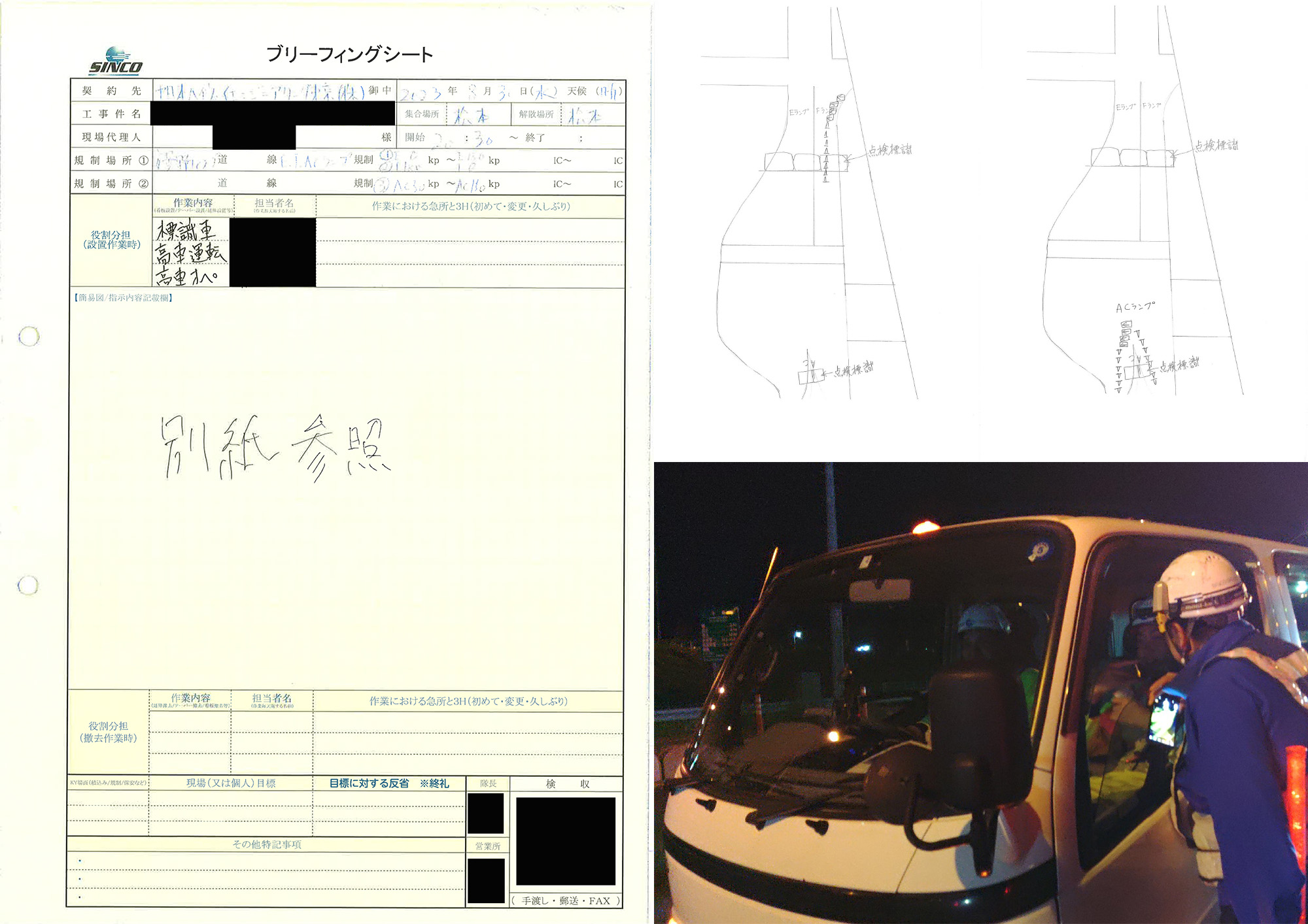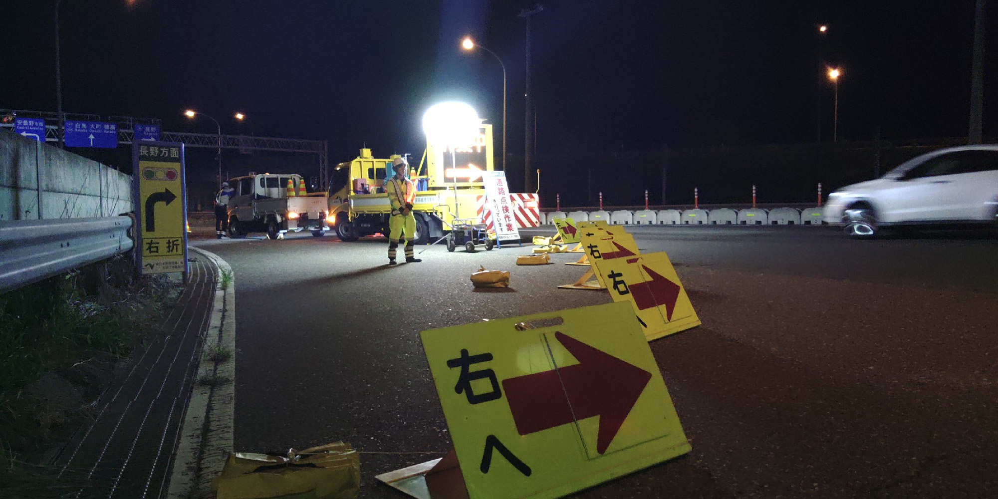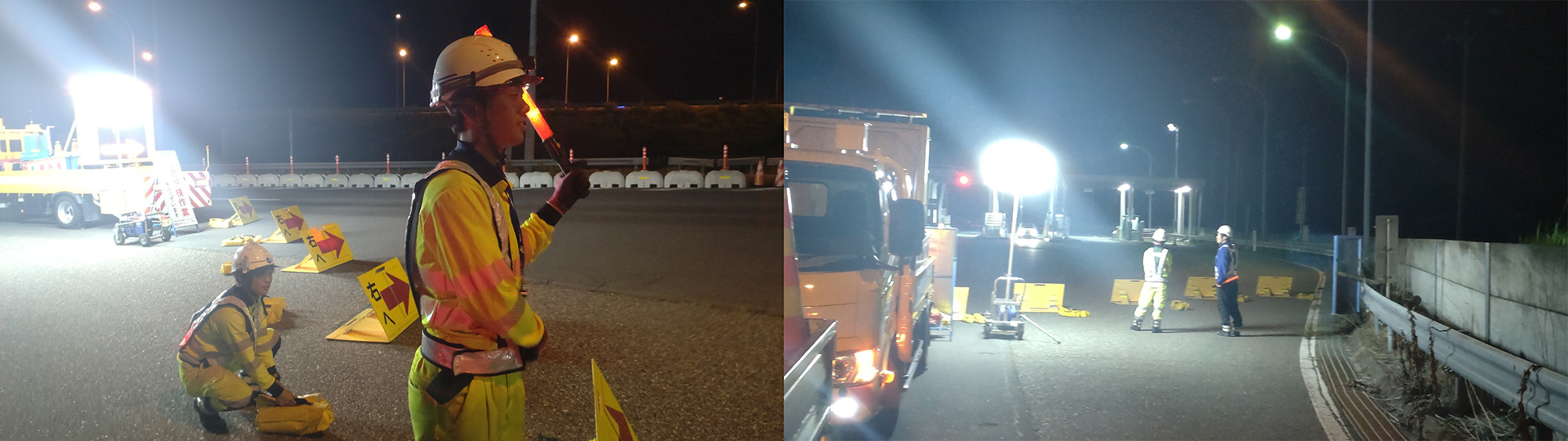 ※指導事項 ・夜間作業ですが湿度が高いです水分補給、塩分タブレットを活用し体調管理をお願いします。 ・保安中や規制撤去前にお互いの顔色チェック、体調確認を行い、 体調不良者がいた場合はすぐに連絡する事。
