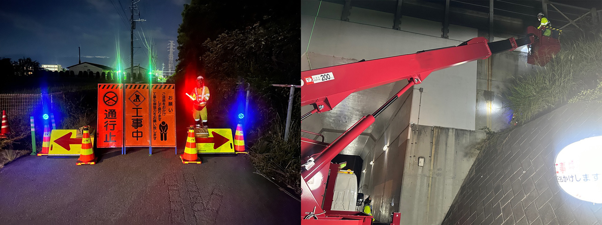 街灯が少ない現場でしたが一般車から見えやすい位置へ光物を設置し工夫が見られました。