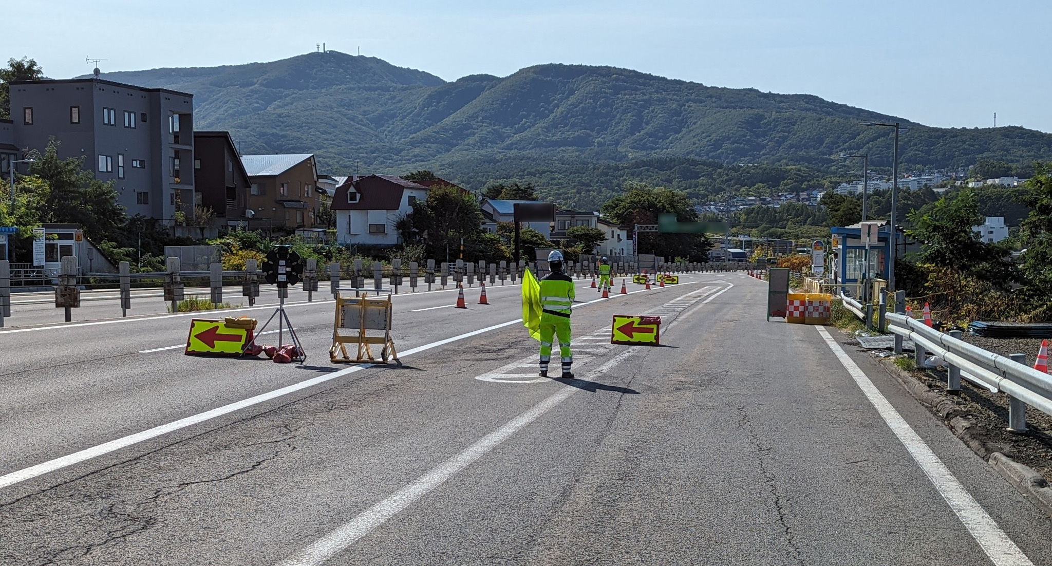 当現場はJCTのランプ新設に伴うバス停が絡む3島規制になります。
