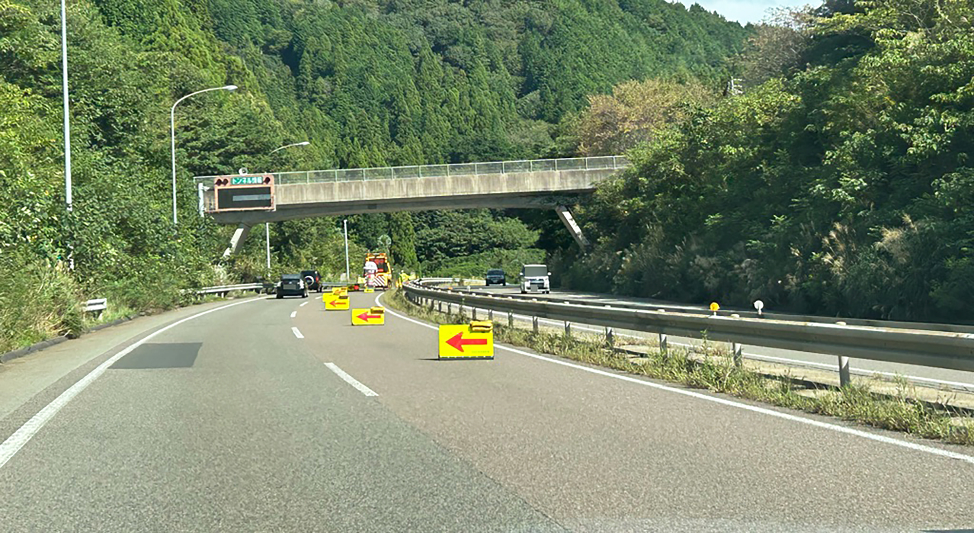 標識設置撤去時は非常駐車帯をジャンプしながらの設置となります。 交通量があまりなく、一般車のスピードが速いことがこの区間の特徴であり、 ジャンプ時にも十分な間隔を得る必要があります。 テーパー位置に関しても、PAからの合流部直後であり右カーブの場所となるため、 設置撤去時十分な注意が必要な規制となります。
