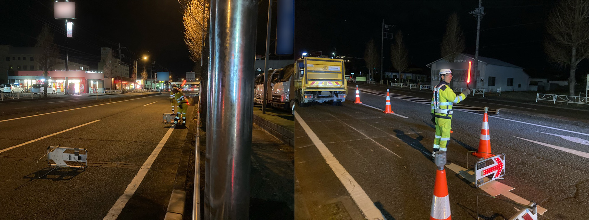 所感 〈高部インターン〉 甲府での夜間街路は昨年度以来であること、 また初日であることを鑑みて3Hパトロールを実施致しました。 今回の規制箇所は深夜まで営業している店舗が隣接している為、 そこを利用する第三者の往来が非常に多く 徹底的に注意を割いていないと事故は発生してしまう危険性があります。 規制に大きく関わらない分、保安・誘導を丁寧に実施していきましょう。