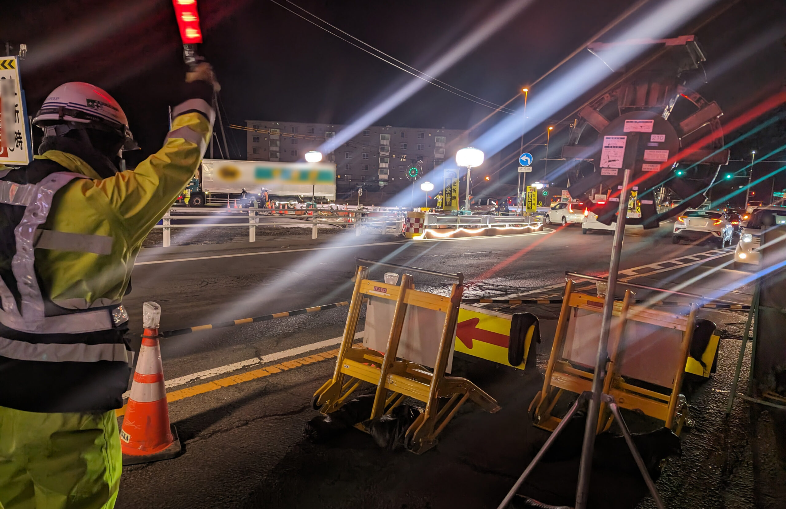 規制設置はトラックの運転を始めたばかりの現場職員に注目して設置作業を見ましたが、