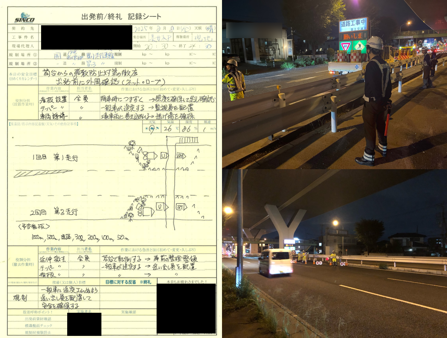 安全パトロール国道17号下り線追越車線規制(埼玉営業所)ブリーフィング内容 ・本日の規制箇所と内容の確認 ・規制手順及び役割の確認 ・正対作業及び周囲確認の徹底 ・飛散防止対策を徹底すること ・熱中症対策を徹底すること