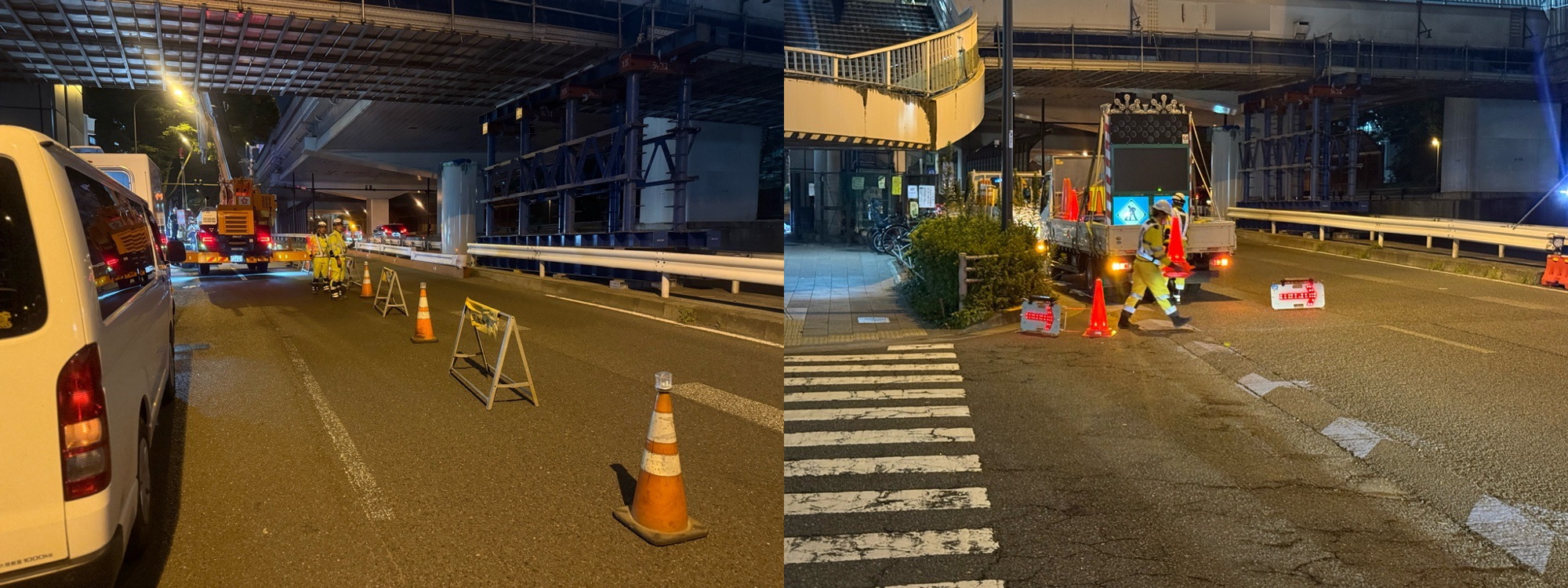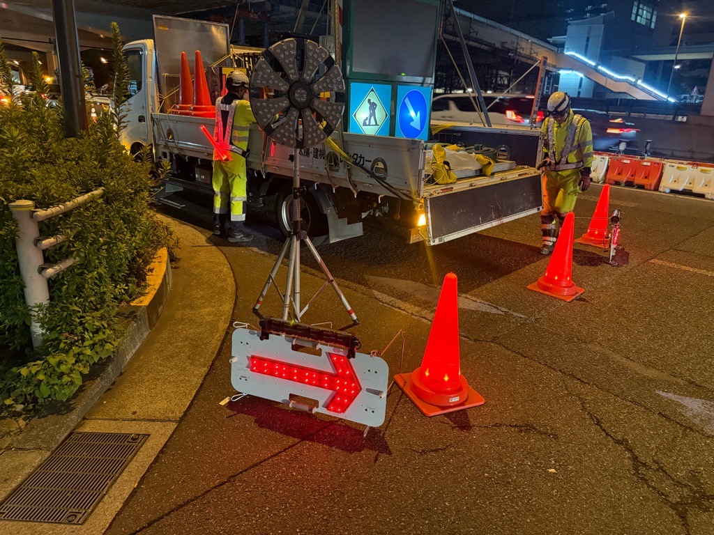 走行側での作業となるが、駅が近くタクシーが停車しやすい場所で追突に注意。