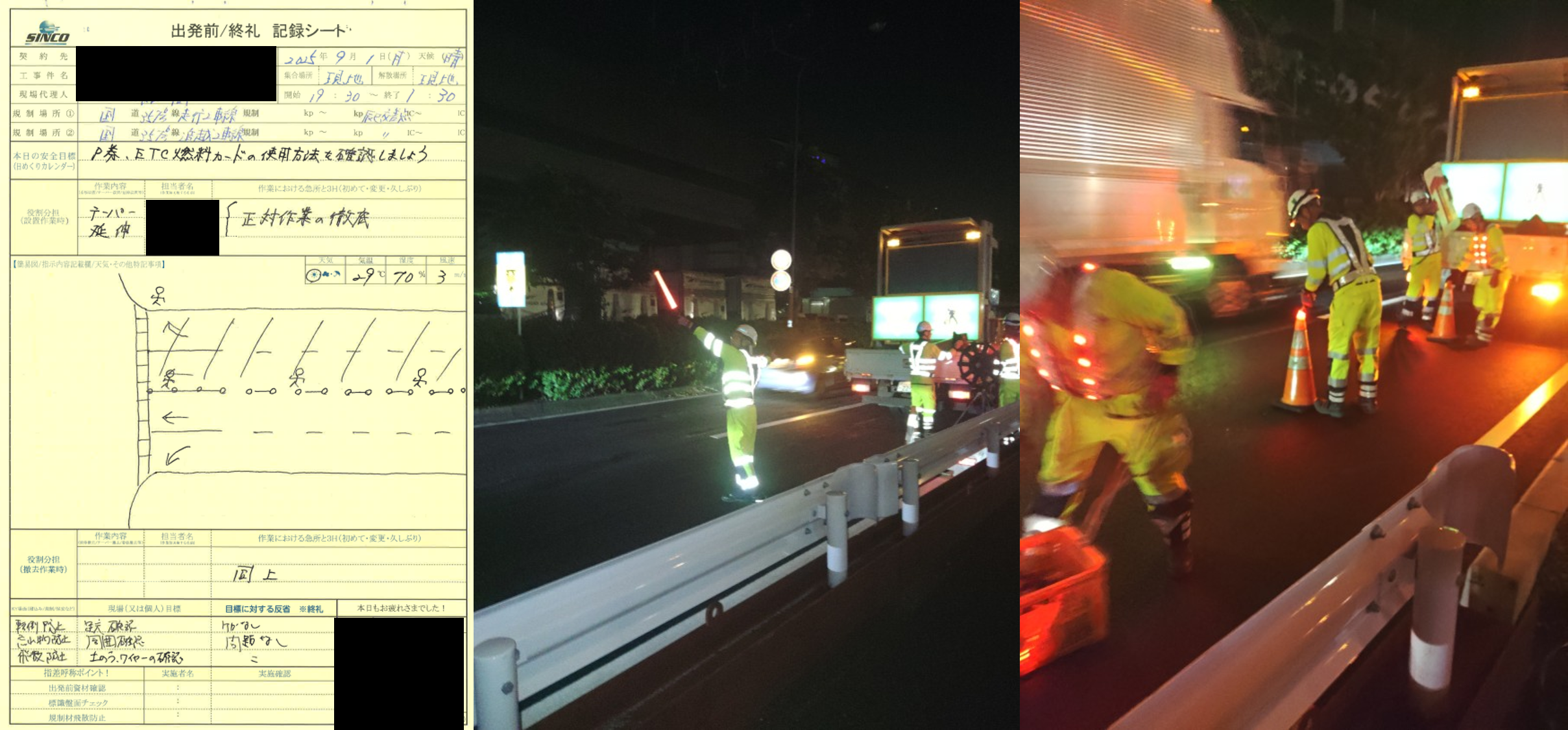 所長パトロール 国道357号西行き追越車線規制(葛西営業所)ブリーフィング内容 指示打ち合わせ事項 ・歩行者対応 歩道を一時的に通路を狭くするので、 丁寧な対応言葉遣い。足元の確認 ・ライン工の為規制切り替えが発生する。 周囲確認 忘れ物防止 指差呼称 ・飛散防止 特に規制内の看板の土嚢とワイヤーで固定 ・竣工の挨拶。