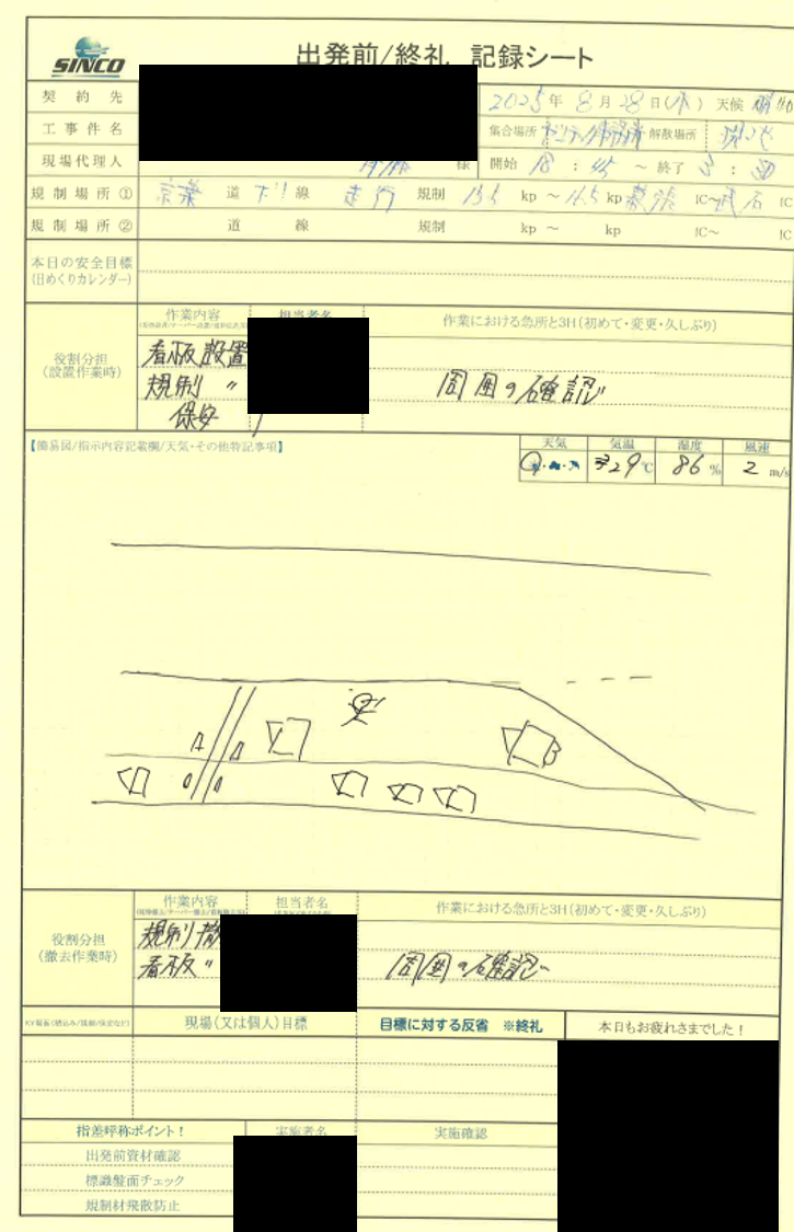 所感 飛散対策、停車時ルーティーンなどやるべき事をしっかりとやってくれていました。 また、お客様の施工に合わせてしっかりと保安することが出来ていました。 現場内ではありますが、【運転中の指差呼称】、【交通ルールの遵守】以上2点を周知し現場を離脱しました。 お客様の話にもあるように、規制の速さには非常に満足いただけているのかなと思います。 迅速かつ安全に作業を行って下さる坂本隊長に感謝です。 お客様の信頼を裏切らないように今後とも教育に励んで参ります。