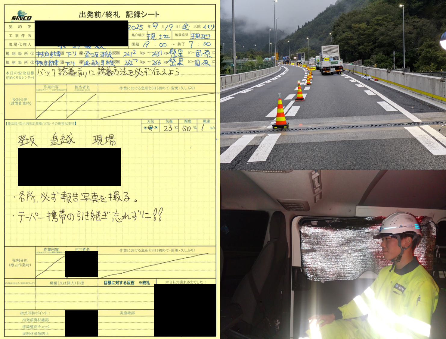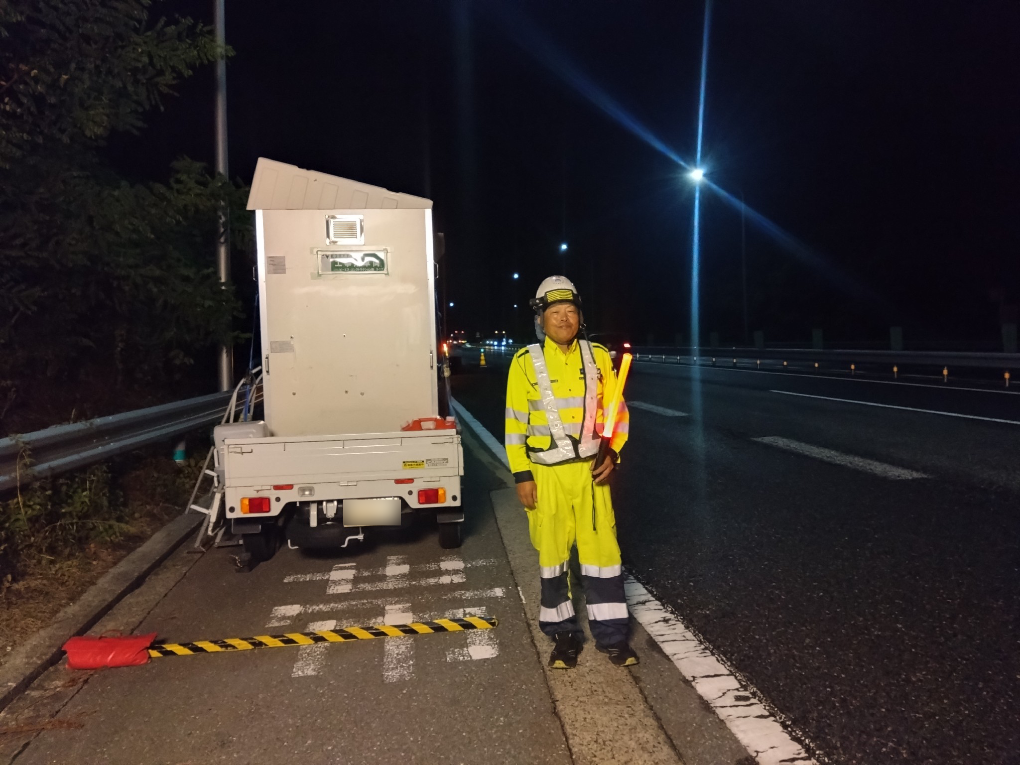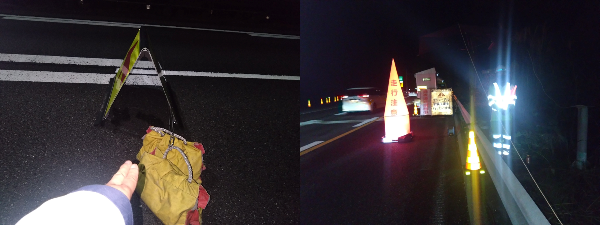 夜間体制にて、登坂車線規制部の保安・テーパー部の監視・現場内の保安巡回を視察を行いました。