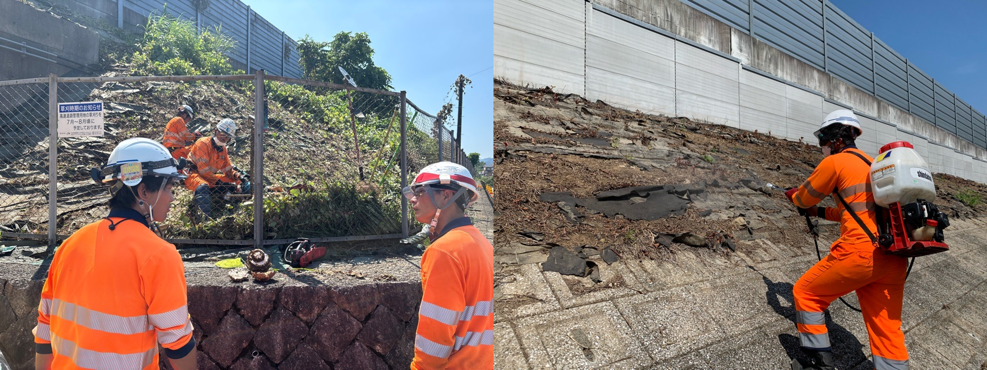 草刈作業・除草剤散布時、防護眼鏡及び防護マスクをテク説に着用し、