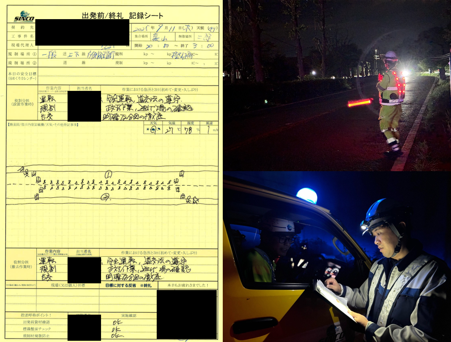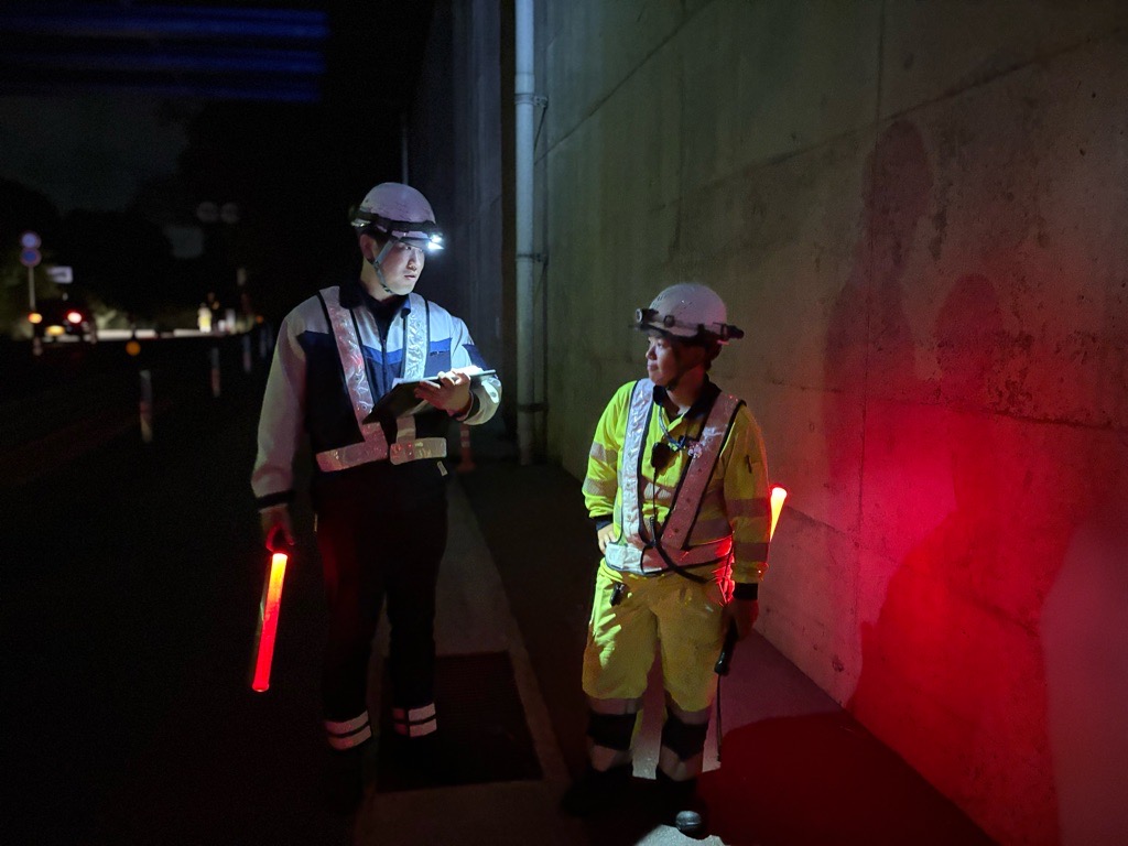 ◇夜間での片交規制です、正対作業及び明確な合図をしましょう。