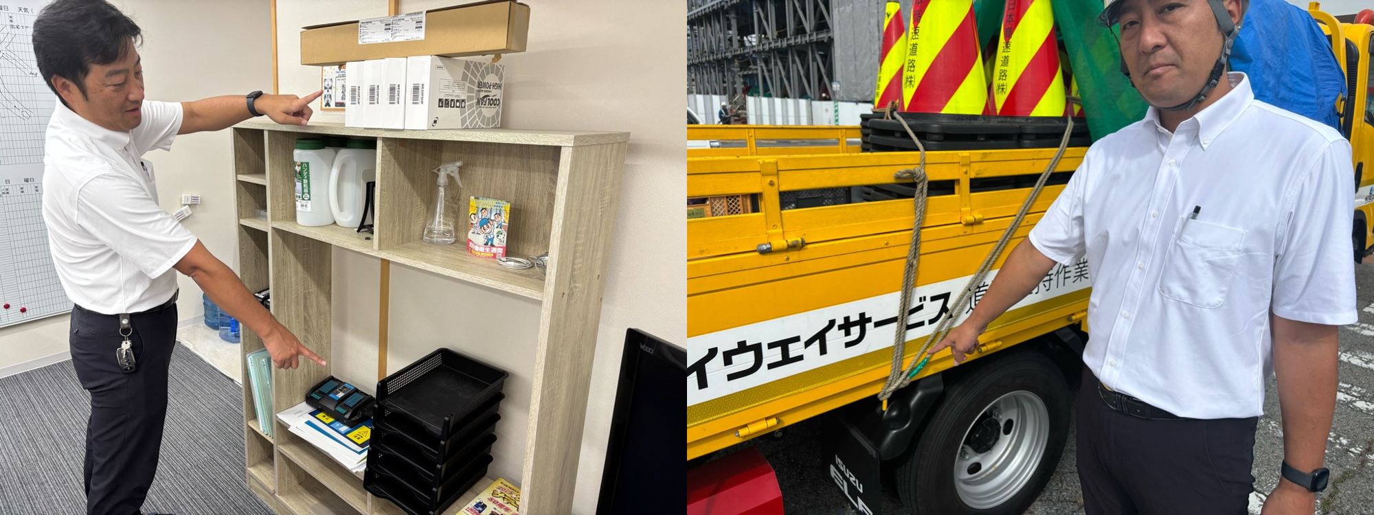 ・標識ラックは業者別に区分け、ロープで音が出ないように養生をしている