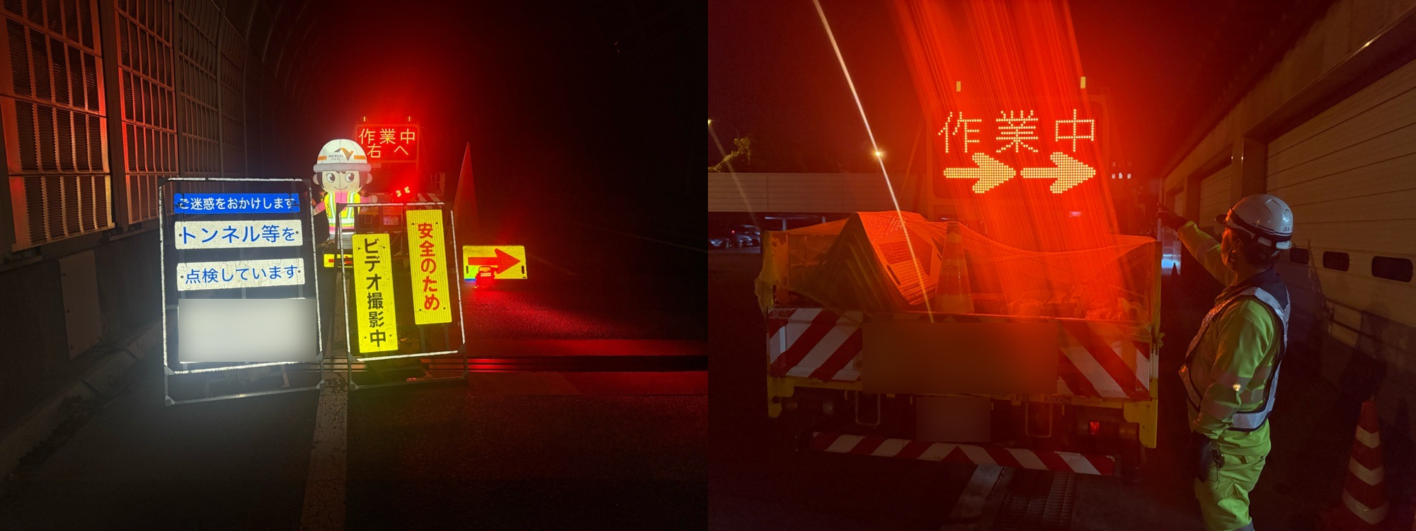 天合峰トンネル内非常駐車帯から看板(500m・300m)を管理通路を通り設置する為、