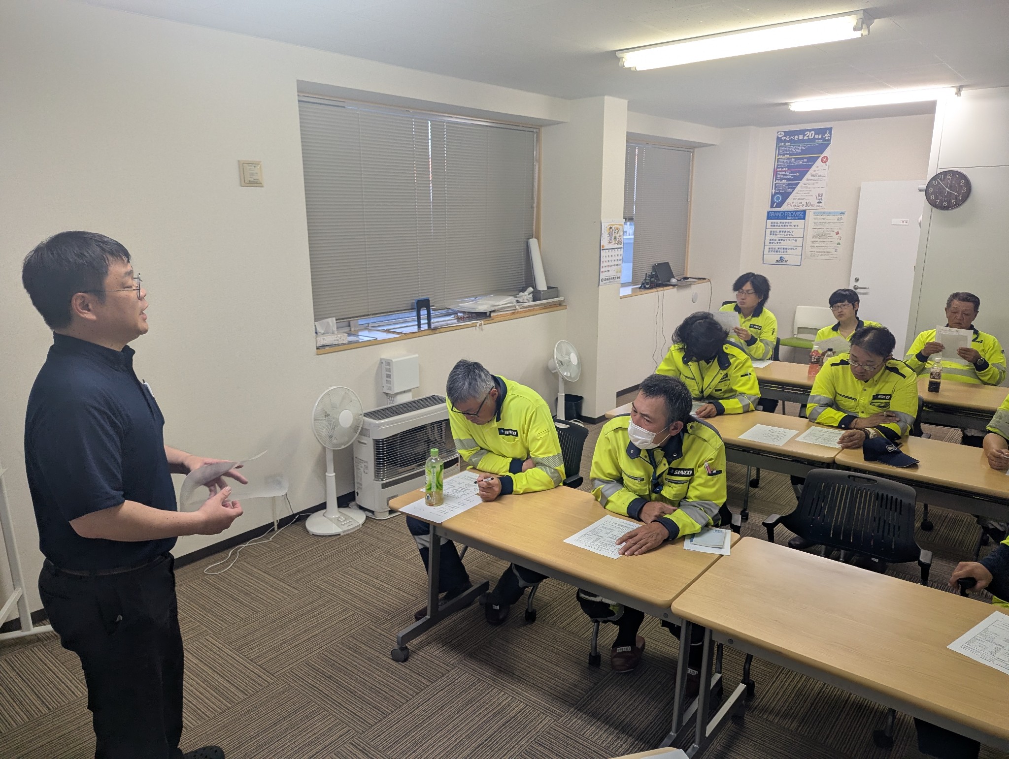 実施場所 :江別営業所_研修室 教育実施者:北海道支社 生形支社長 江別営業所 中澤主任 日時:2025年09月22日 16:00~17:30 天候: 天気 晴 気温 21 ℃ 湿度 65 % 教育対象者:32 名 (システムチーム 黒野)