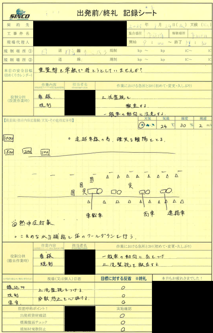 所感 気温差が激しい・ちょっとした重量物が多いため ・適宜水分補給の徹底 ・保安時の水分携帯 ・こまめな休憩時間の設定 ・クッションドラム、件名看板は必ず2人以上で作業を行うこと 周知致しました。 規制箇所につきましては、線形もよい場所であったが、 近くの路地に曲がる車も多かったため、 できる限り交通の妨げにならないように指導致しました。 営業所として、隊長や現場職員さんが相談しやすいような営業所づくりをしてまいります。