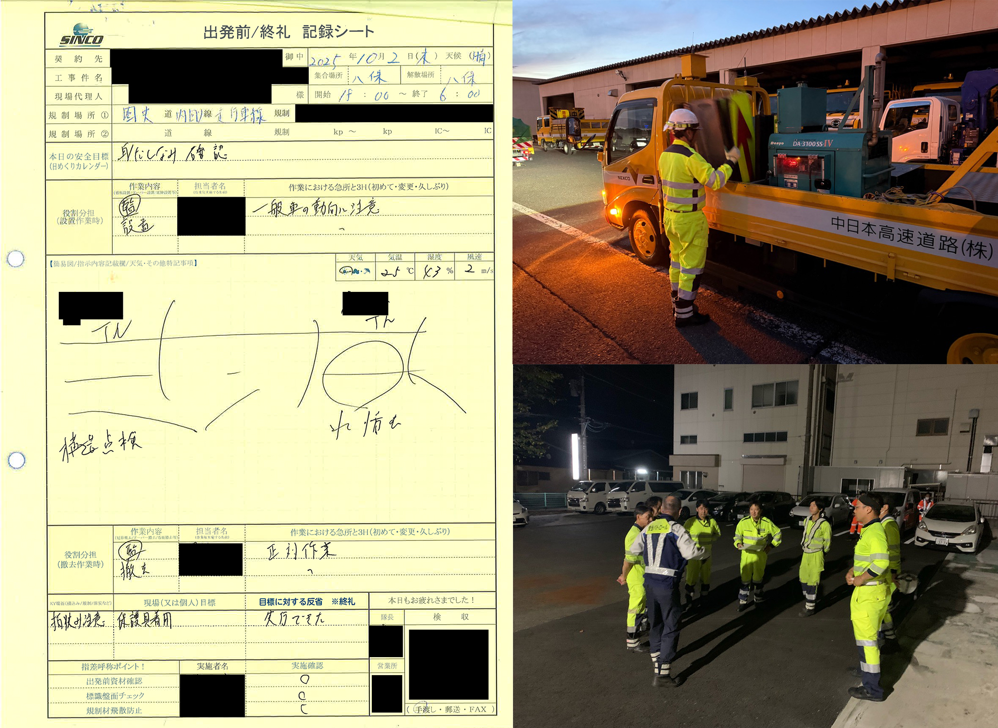 営業所での資材準備につきましては、前回との規制キロポストの変更や隊長の交代等もあり、忘れ物がないようにチェックリストを用いつつ準備を行なっておりました。
