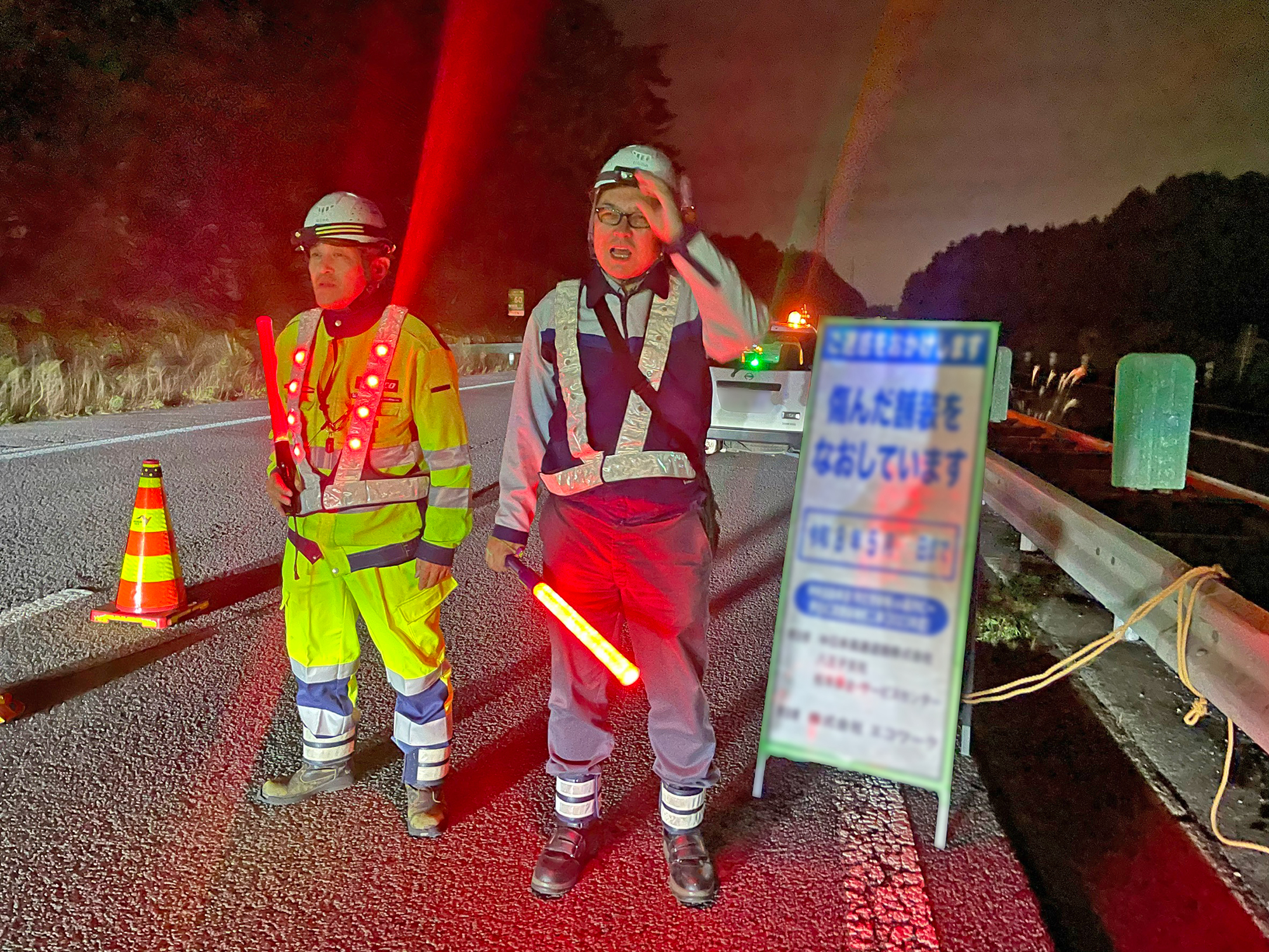 施工帯付近のバルーンライトは明るく現場全体の視認性は良好ですが、上流で監視に当たる保安員が照明の影になることで、かえって一般車からの視認性が悪化する可能性があるため、注意が必要だと感じました。