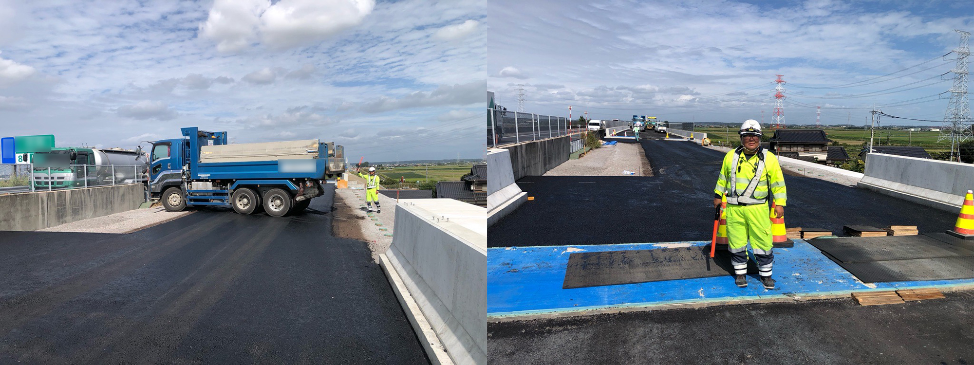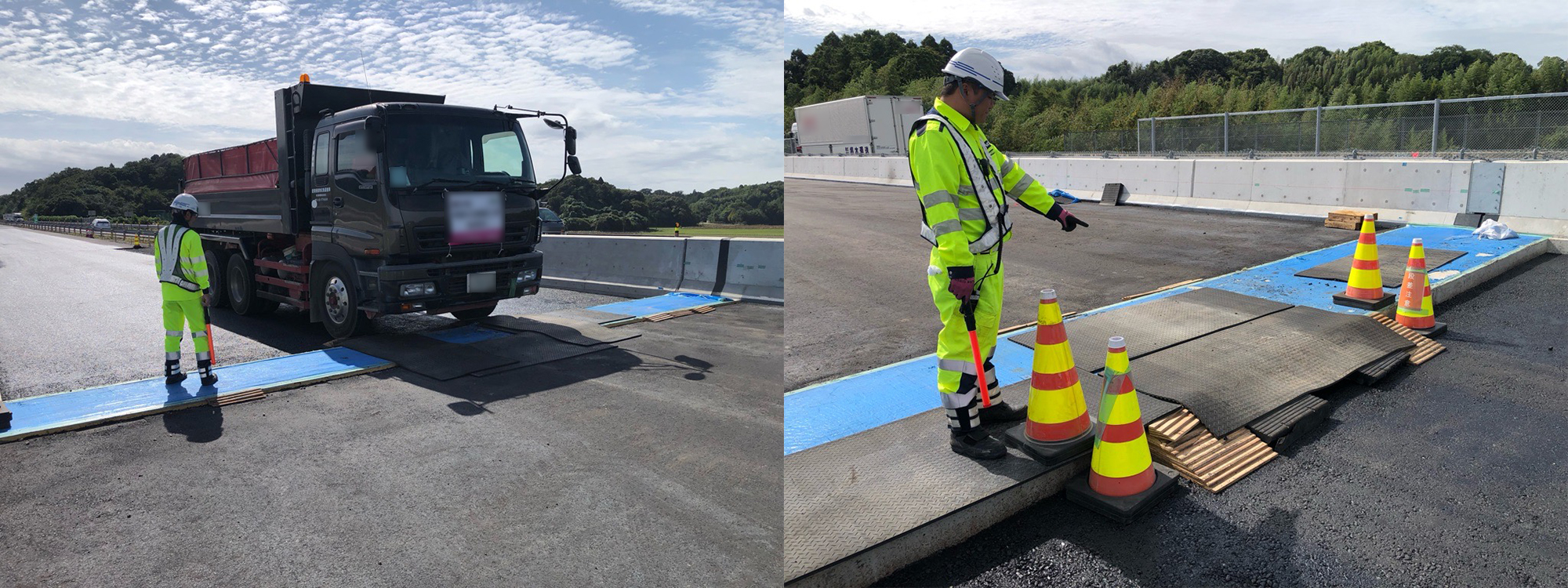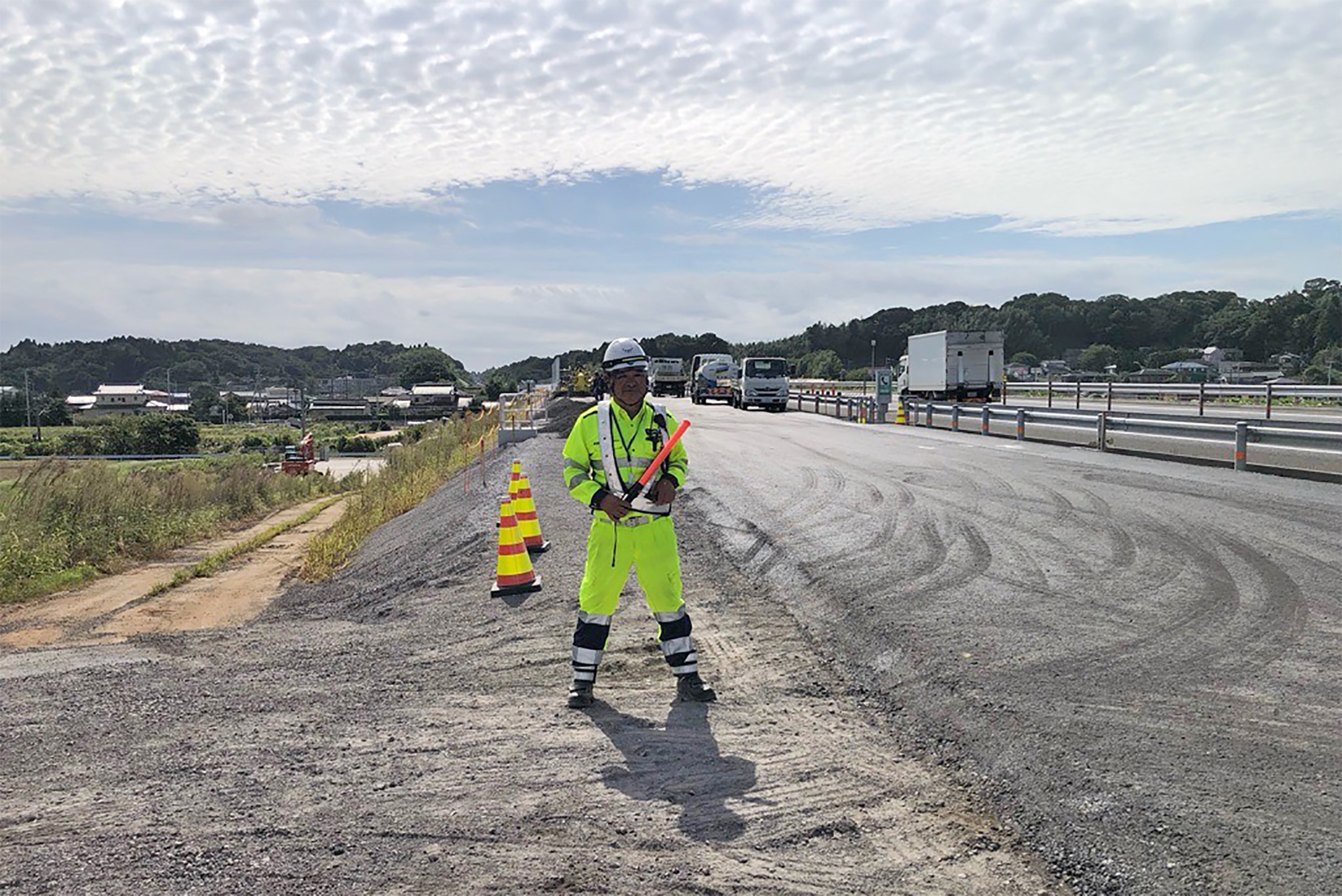 施工場所は一般車の往来の無い場所で、当社の業務は工事用車両の誘導と工事車両が段差を通過する際のハシゴの踏み外し防止とハシゴ修正。