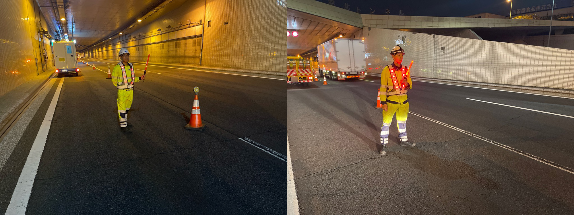 トンネル前からの規制になる為、下り坂でカーブしかも制限速度が80km/hの場所がテーパー部という悪条件でしたが、ベテランの現場職員がしっかりと安全確認しながらやってくれていたのは安心感がありました。
