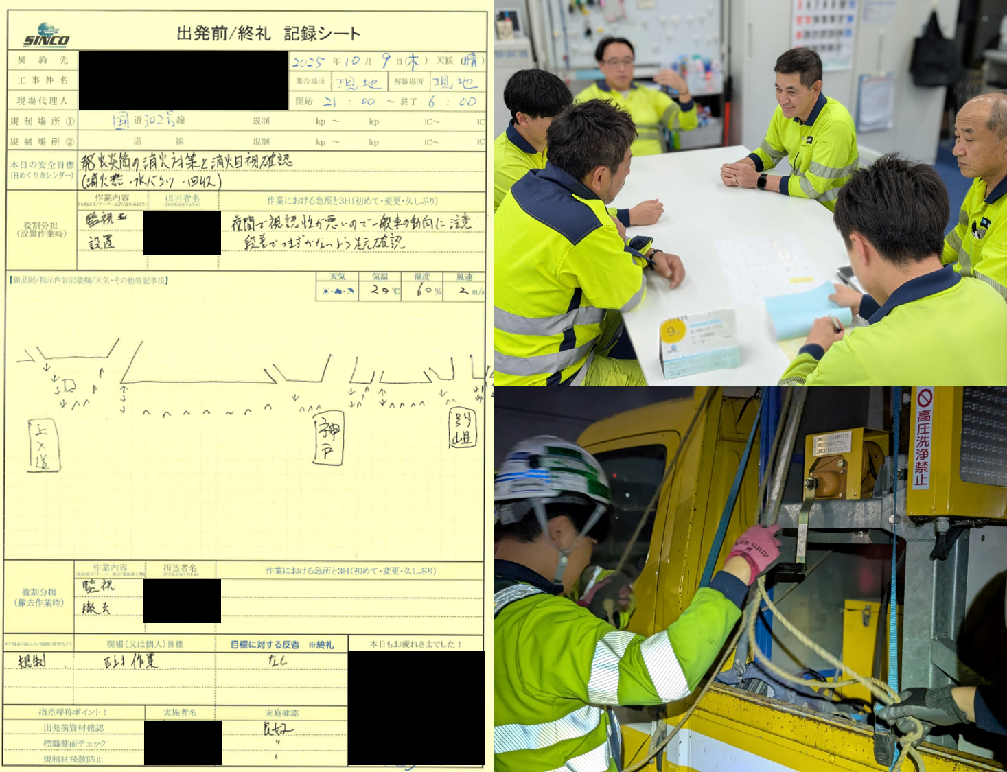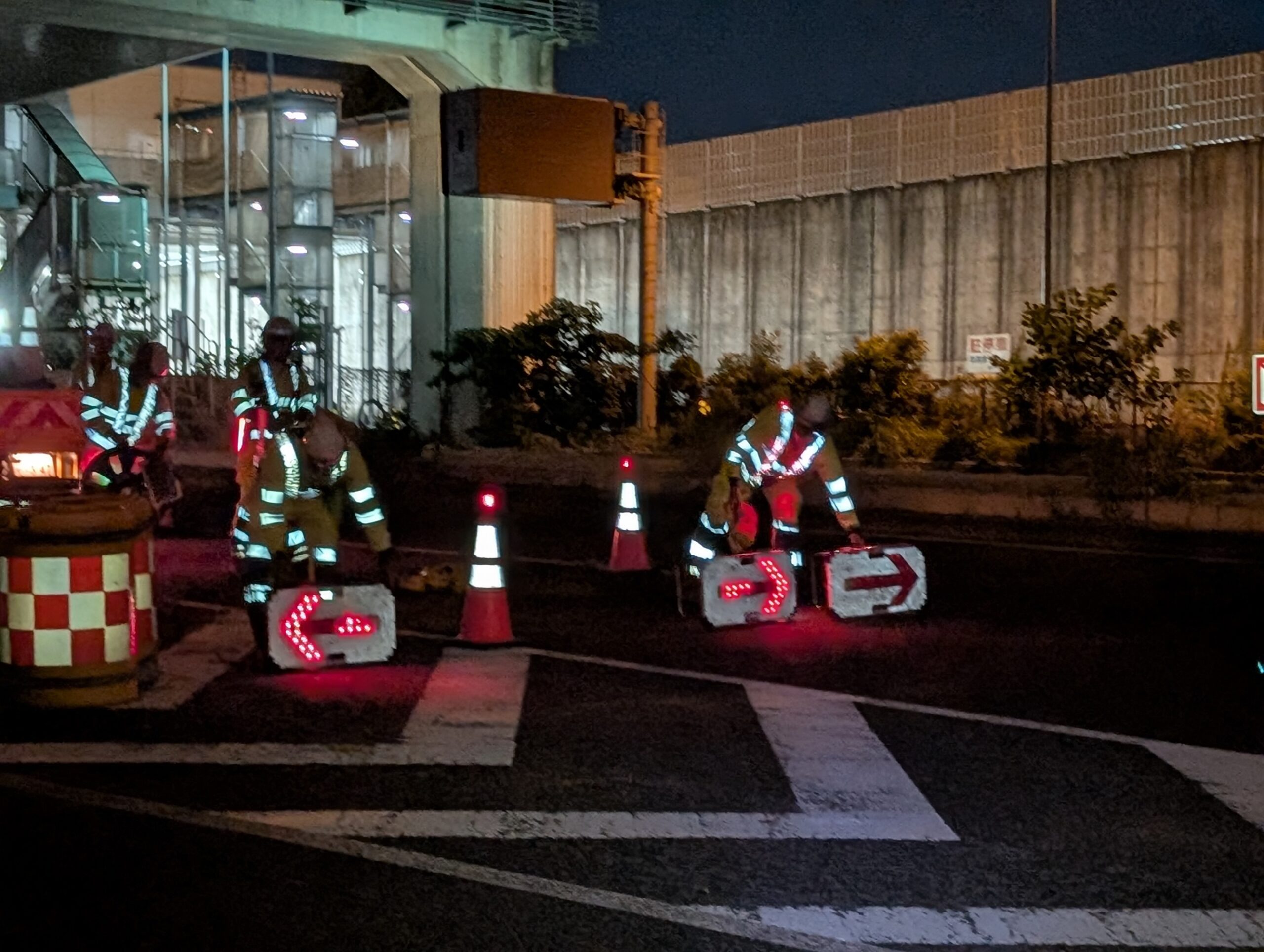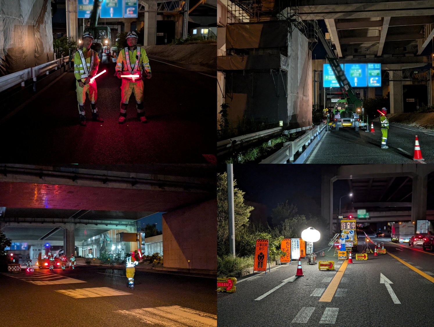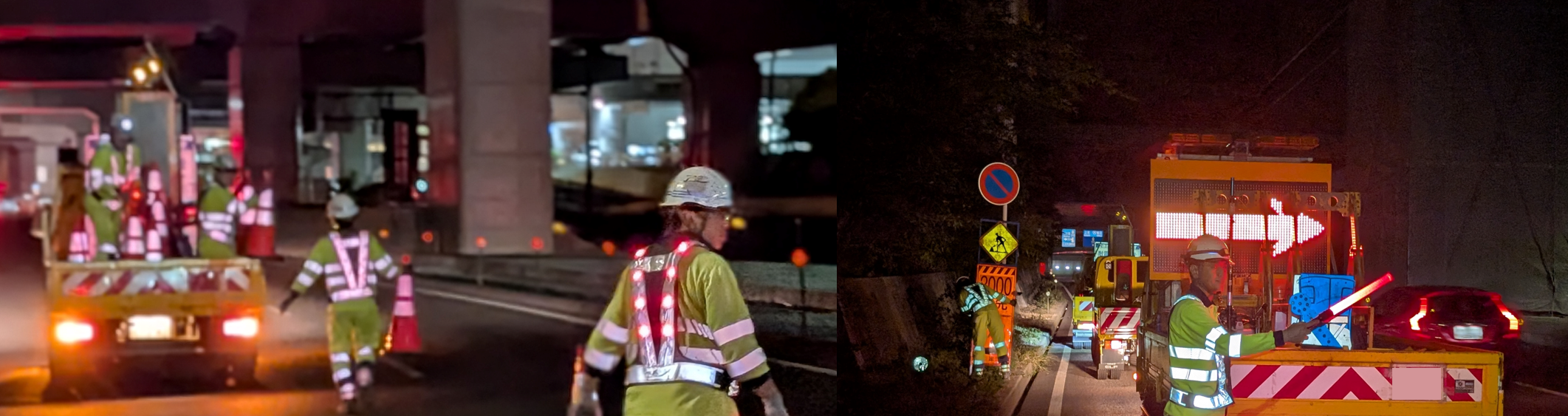 当現場は昼はヤード内での誘導、保安ですが、夜間は車線規制を行い、誘導ならびに保安業務があります。