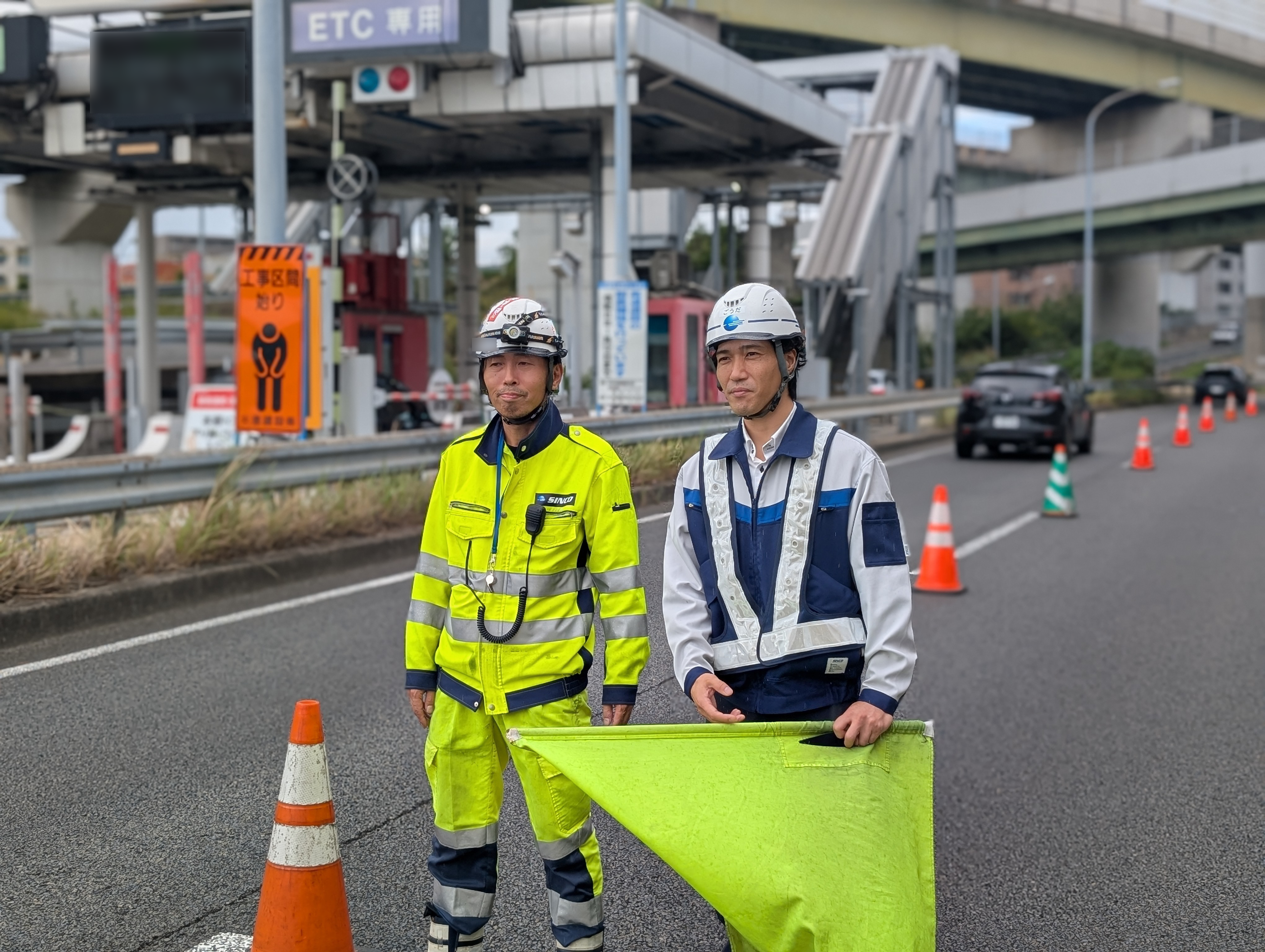 規制箇所での作業でしたが監視員が一般車へ注意喚起を大きな合図で行っており