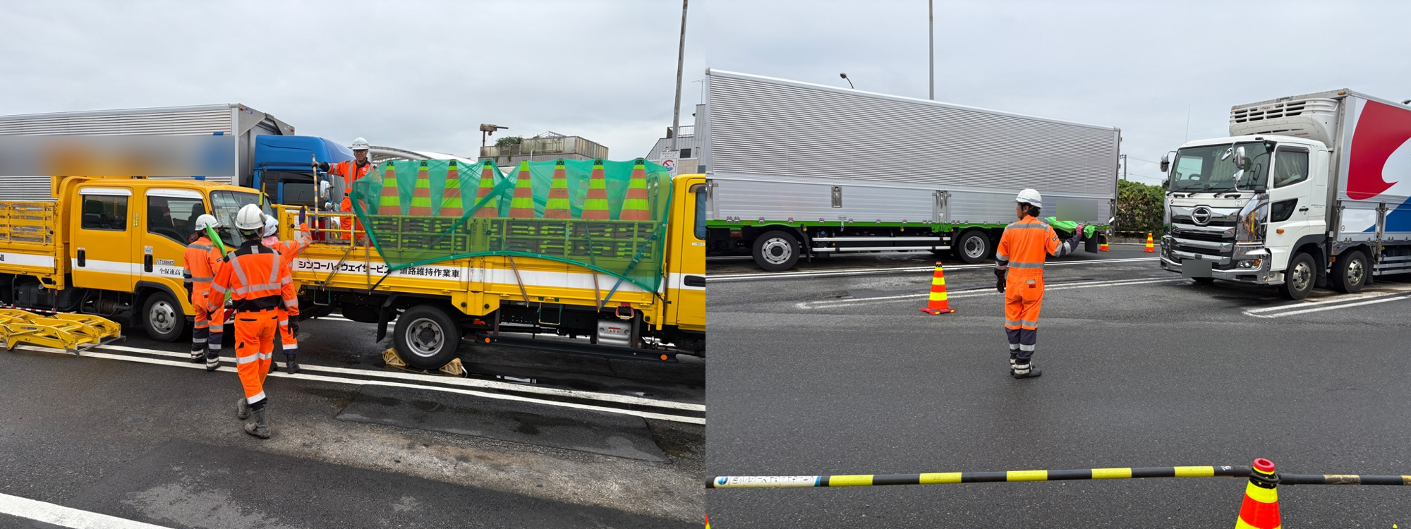 石川PA内の大型マスの半たわみ舗装の規制と保安をパトロール実施。