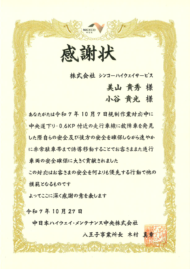 中日本ハイウェイ・メンテナンス中央株式会社様より感謝状を頂戴しました