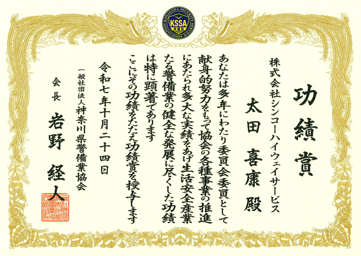 多大な実績をあげ警備業の健全な発展に尽くした功績に対し、功績賞を戴きました。