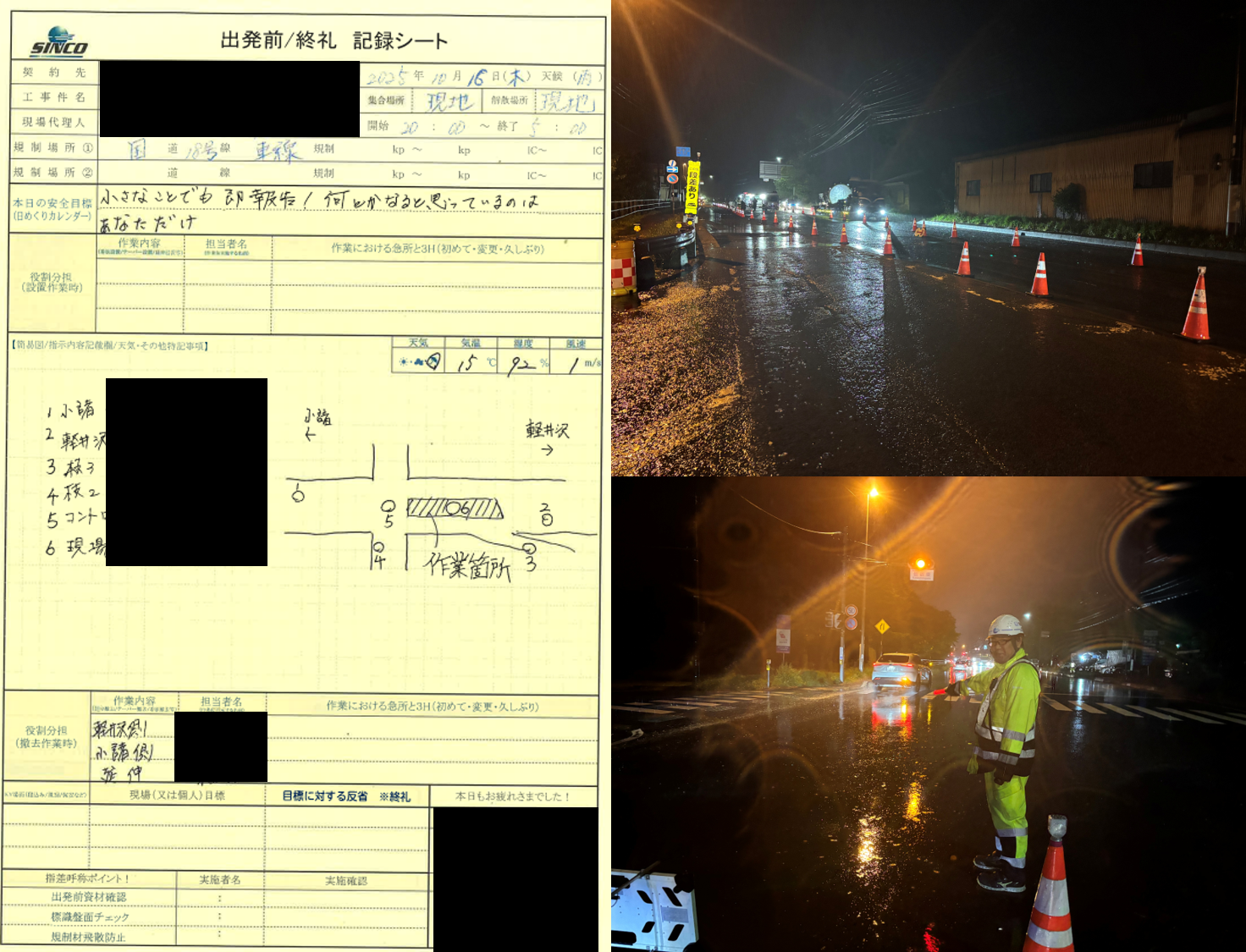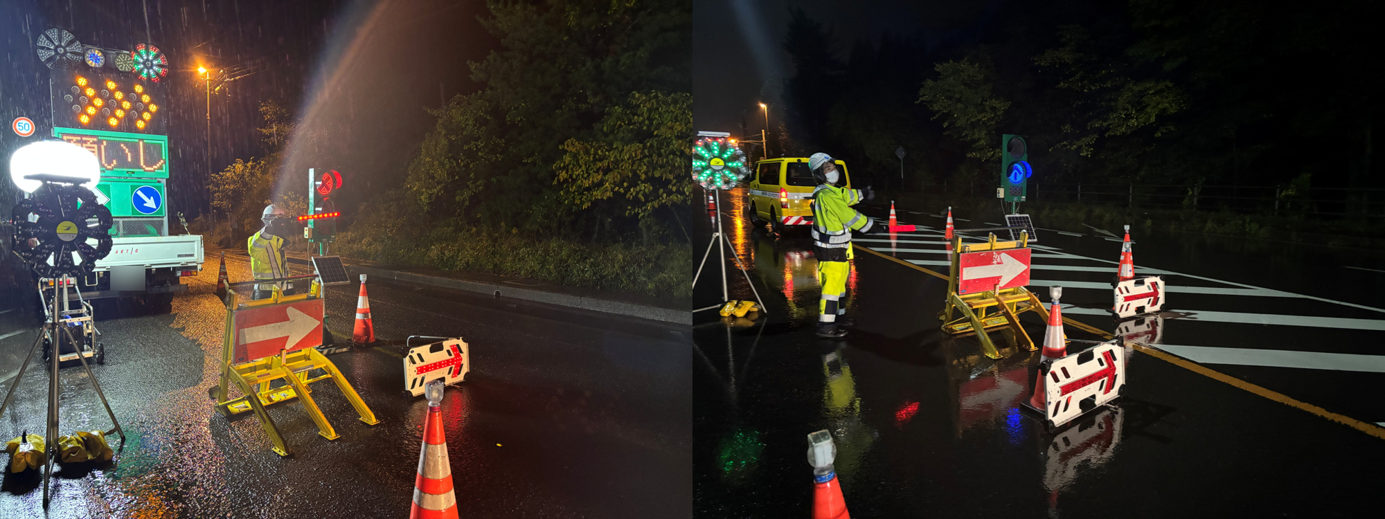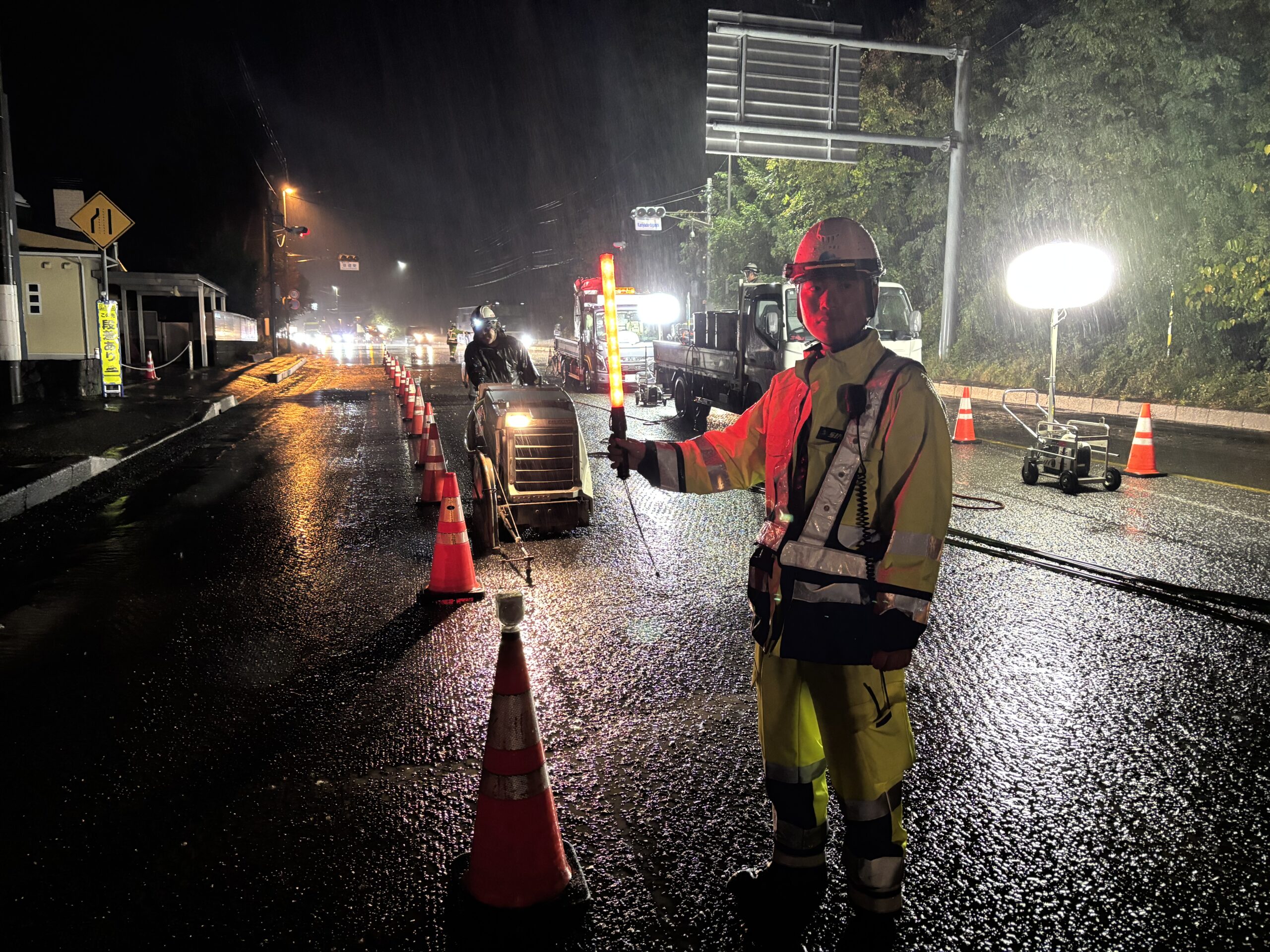 規制設置時から雨が降り始め、視界が悪い中での作業となりましたが、