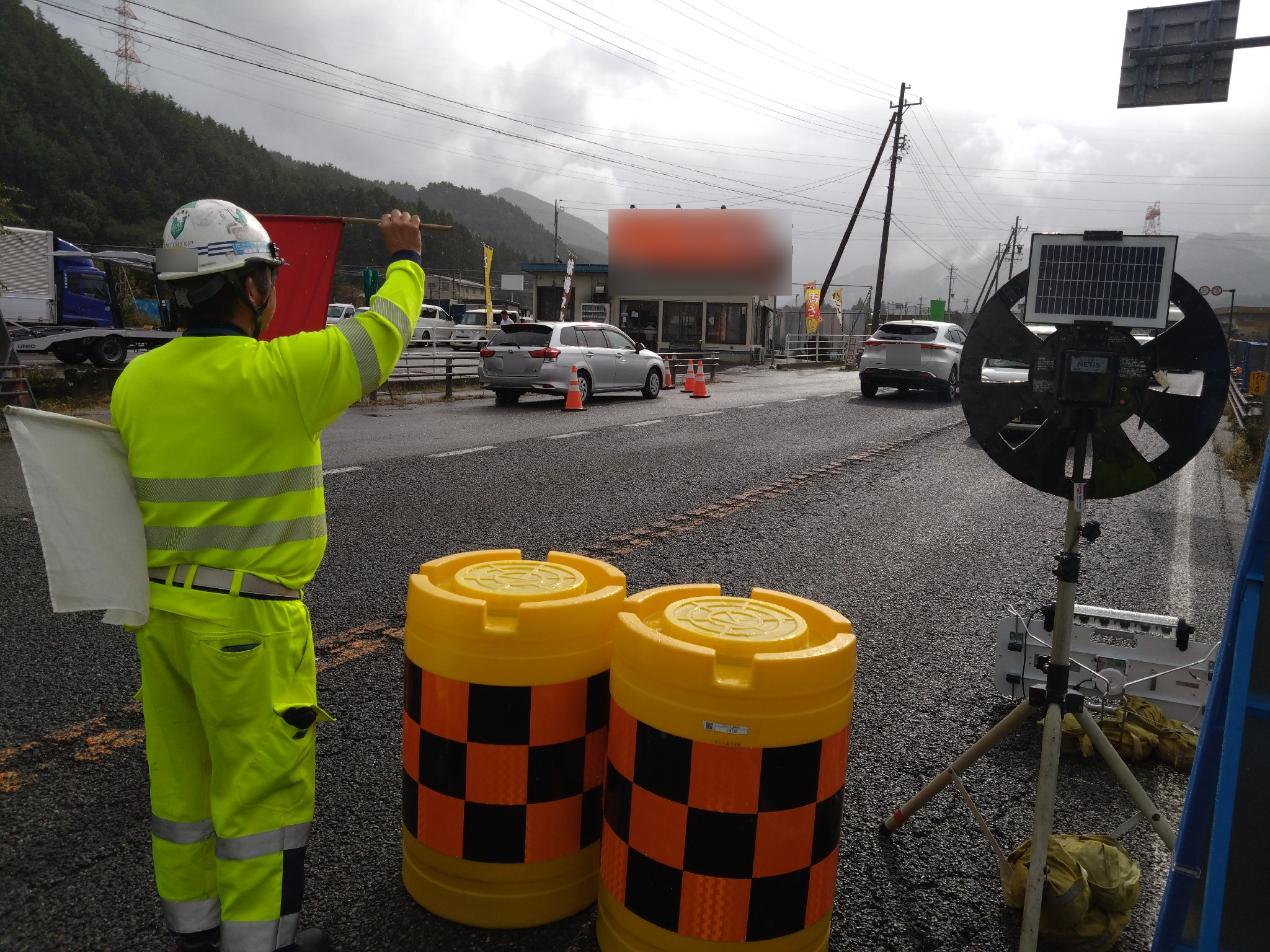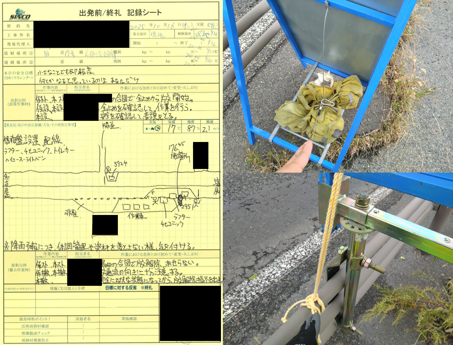 所感 3H(初めて)に該当する現場という事で、パトロールを行いました。 規制箇所は国道19号線になりまして、規制形態は片側交互通行規制になります。 先方様の本日の作業内容といたしましては、情報盤の交換になりまして、 16tラフタークレーンや4tユニッククレーン等が流入します。 今回の規制の予告看板については梯子+土嚢ではなく、T字型の看板用ブラケットの使用となります。 梯子+土嚢より設置撤去に時間が掛かる事が確認できましたが、 焦らずに作業を行っていました。 規制・誘導については、基本を忠実に行っていました。