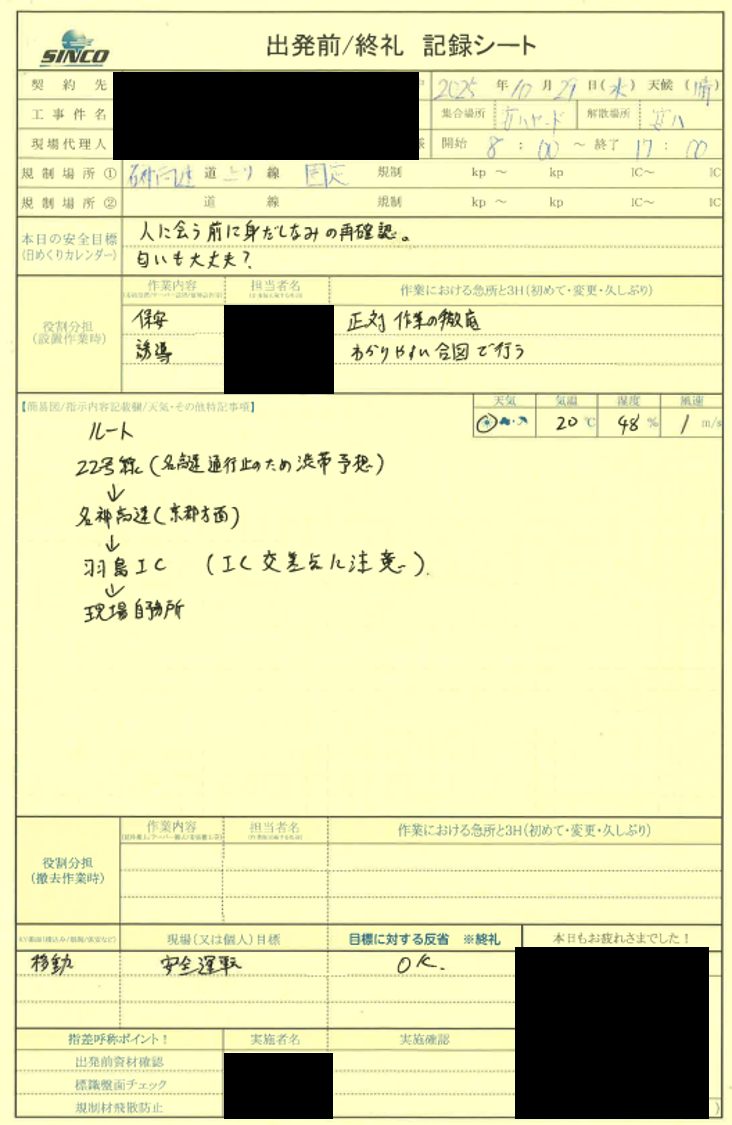 安全パトロール 名神上り線便乗(名古屋西営業所)ブリーフィング内容 車両誘導はギリギリを攻めずに余裕をもって行うこと。 車両流出時は車間距離300m以上空けて流出を行うこと。 見られている意識を持って保安すること。 移動時の右左折一時停止すること。 運転時の指差呼称。