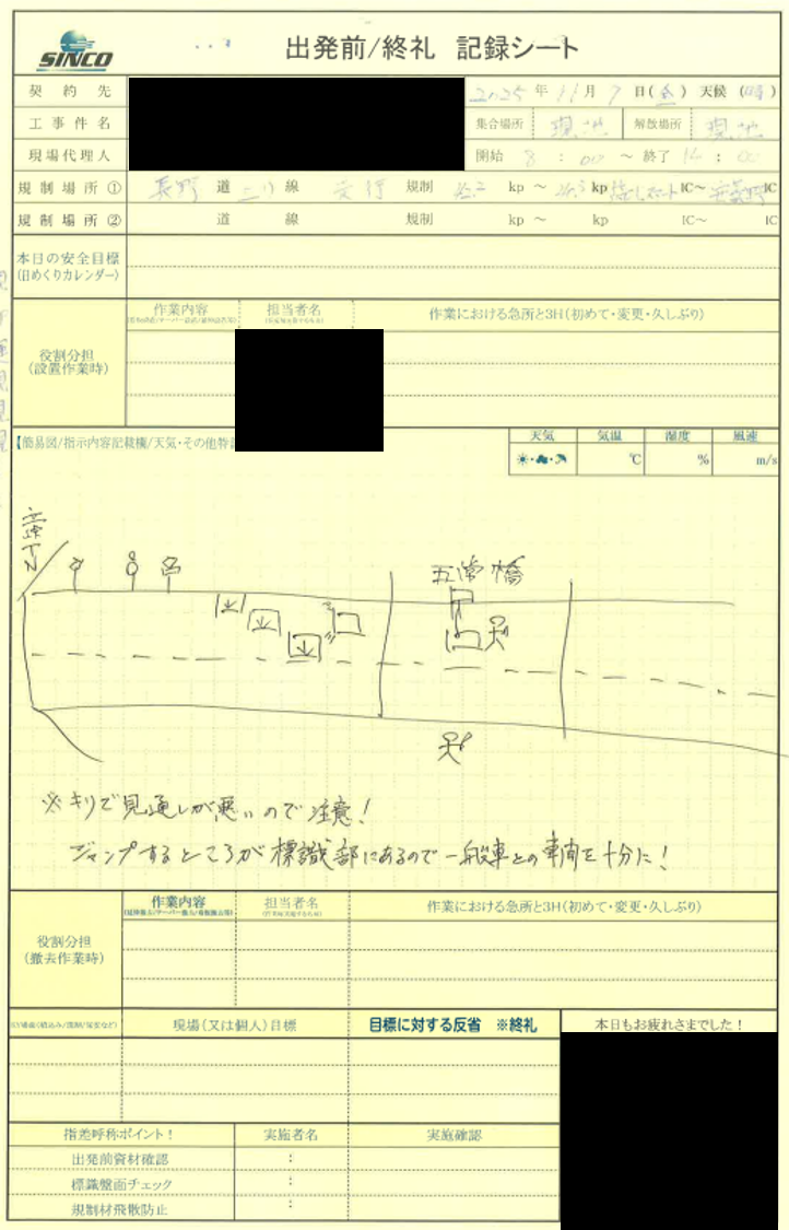 営業所パトロール 長野自動車道上り線走行車線規制(松本営業所)ブリーフィング内容 隊長が下道を見ることになったが、それ以外は普段と同じメンバーでの作業になります。 いつも通りをキープして安全に作業しましょう。