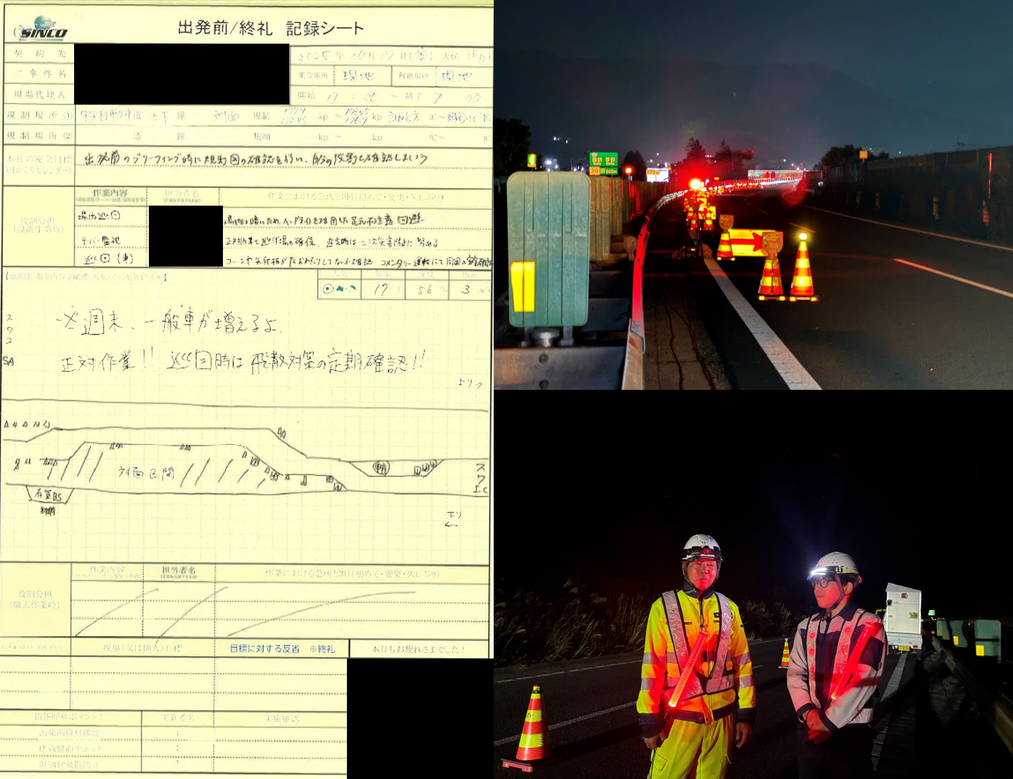 巡回時→コーンや矢印板が倒れていないか詳細に確認する。コメンタリー運転を行い、漫然運転の防止。
