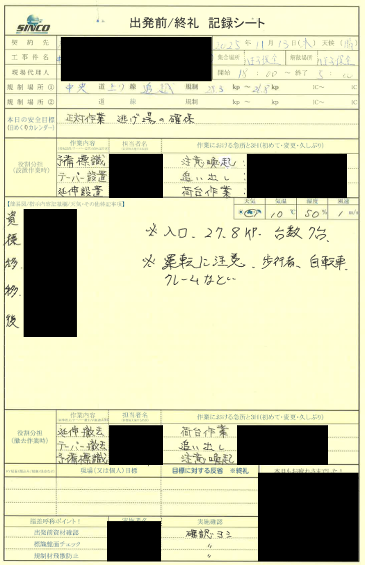 インターンパトロール 中央自動車道上り線追越車線規制(八王子多摩営業所)ブリーフィング内容 ❑本日の安全目標【正対作業 逃げ場の確保】 ❑天気:晴 気温:10℃ 湿度:50% 風速:1m/S ❑注意事項 ・車両流入入口 27.8kp 流入台数:7台 ・車両回送時を含めて運転に注意 ※歩行者・自転車などクレームにならないように周囲に注意