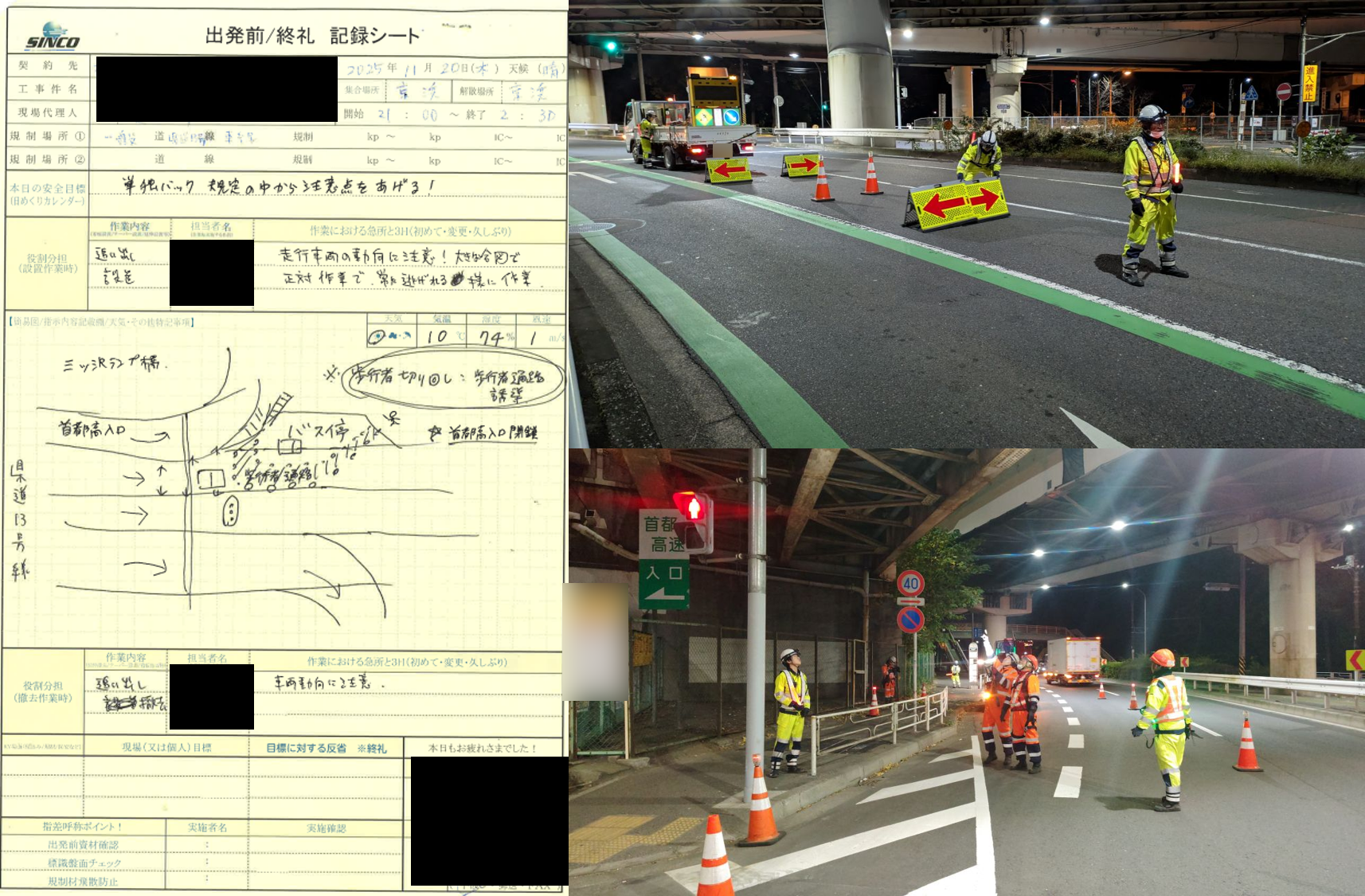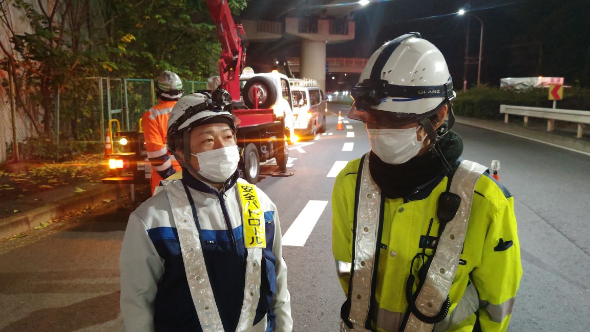 ブリーフィング内容 □規制場所・規制切替の手順の説明 □役割分担・監視員の任命 □寒さ対策の徹底所感 【総評】 安全な規制作業・高所作業・運転はチームとしての意識を向上させなければならないと考え ・助手席者と協力しコメンタリー運転が行えているか? ・協議通り(規制図通り)の規制が実行されているか? ・監視員とオペレーターの打合せ密に行えているか? 上記を重点項目と定め現場パトロールを営業所長大竹と安全室船橋とで実施致しました。 【規制設置環境】 左カーブの始まりがテーパー部となっていた為、一般車からの視認性は良好。交通量もすくなく 信号機が赤になるタイミングで規制の切替を行える等環境は良好でした。 【コメンタリー運転の実態と監視員とオペの打合せ状況の確認】 新人隊員へコメンタリー運転の実施状況を聴取したところ、 まだ慣れていない為、忘れる事もあるが 先輩隊員に指摘されるので意識するようにしてるとの回答で、 全員100%までとはいかないまでも徐々 にする人が増えてきて浸透しているのを感じました。 オペレーターと監視員の打合せ状況ですが、 その場所の点検作業が終わり場所を移動する度に、お客様 を交えて具体的な支障物の確認と監視員に 見て欲しいポイントを説明しており、打合せ状況は良好でした。