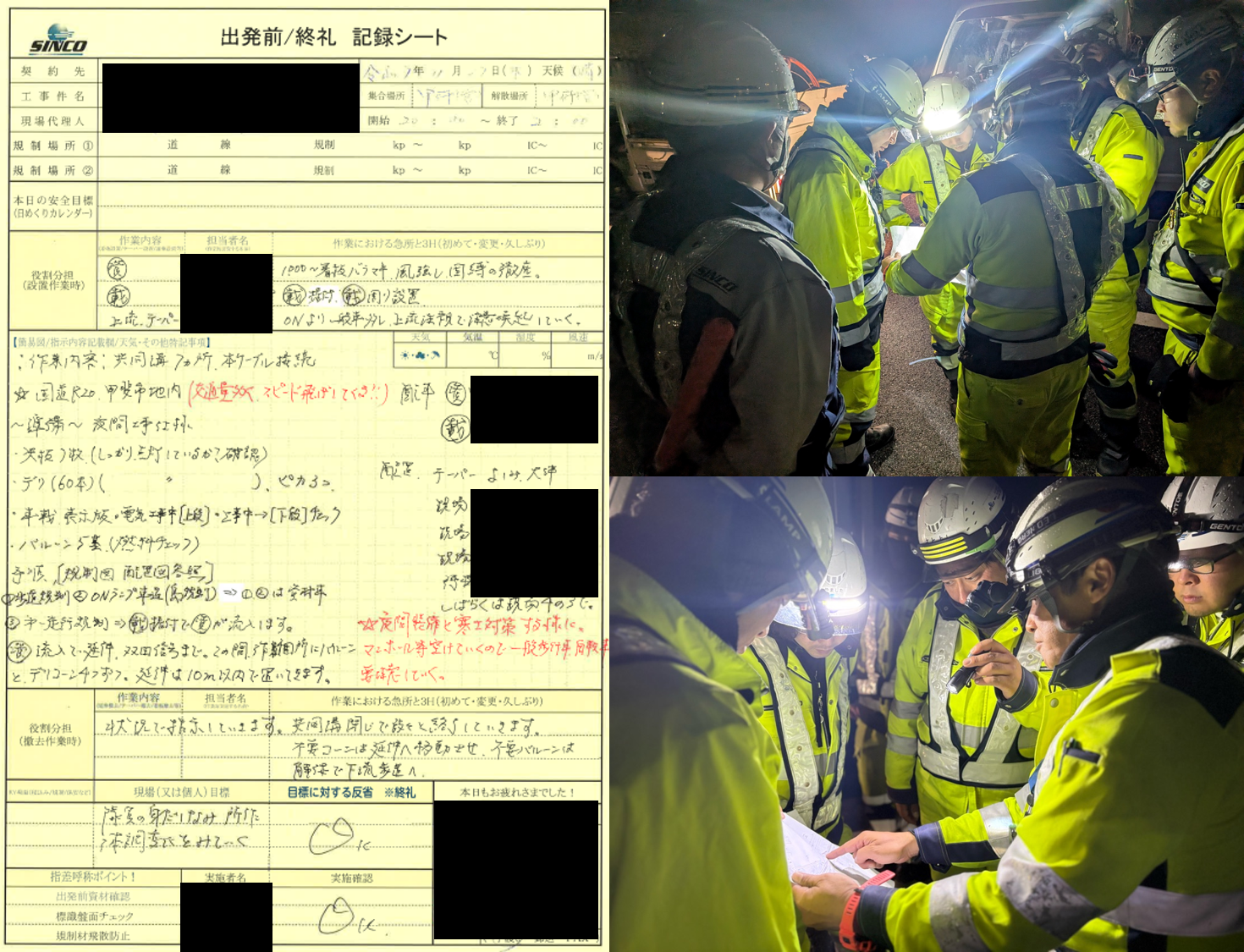 直近の労災事故の周知をし、ヘッドライト必ず着用し足元確認しながら怪我をしないように伝えました。