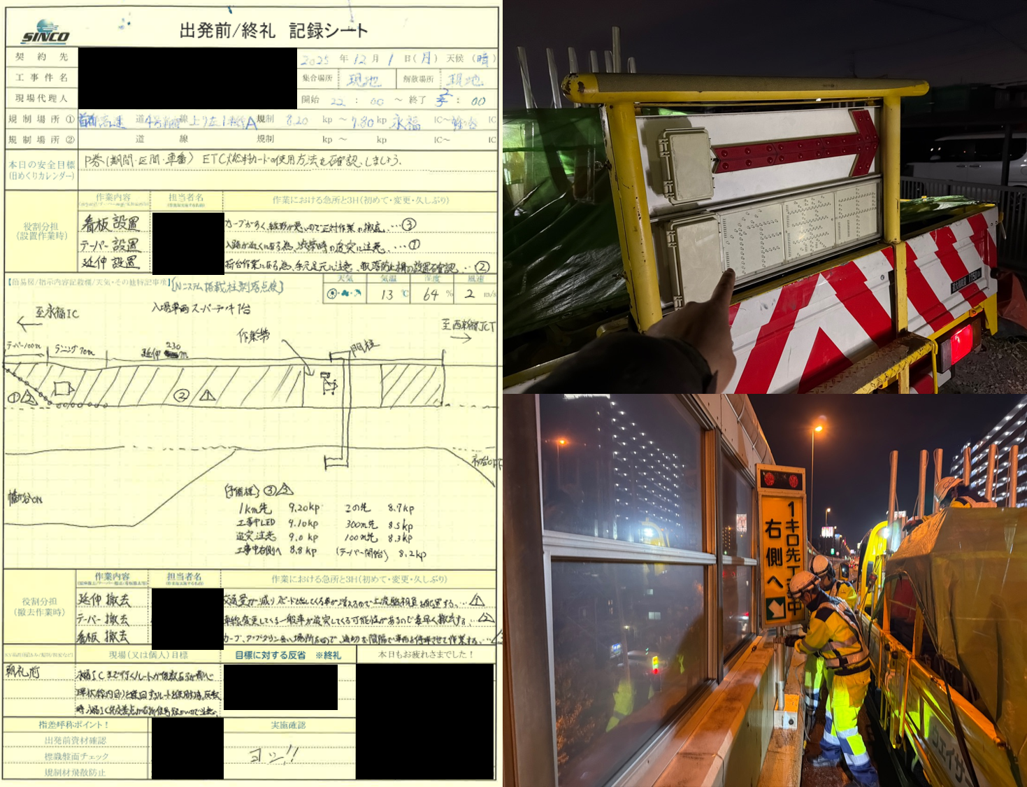 安全部パトロール 首都高速 4号上り線左車線規制(加平営業所)ブリーフィング内容 ・予告看板の表示を必ず確認すること ・正対作業の徹底 ・指差呼称確認をすること ・移動時はコメンタリー運転を実施すること ・発炎筒投下時はスピードを充分に落とすこと