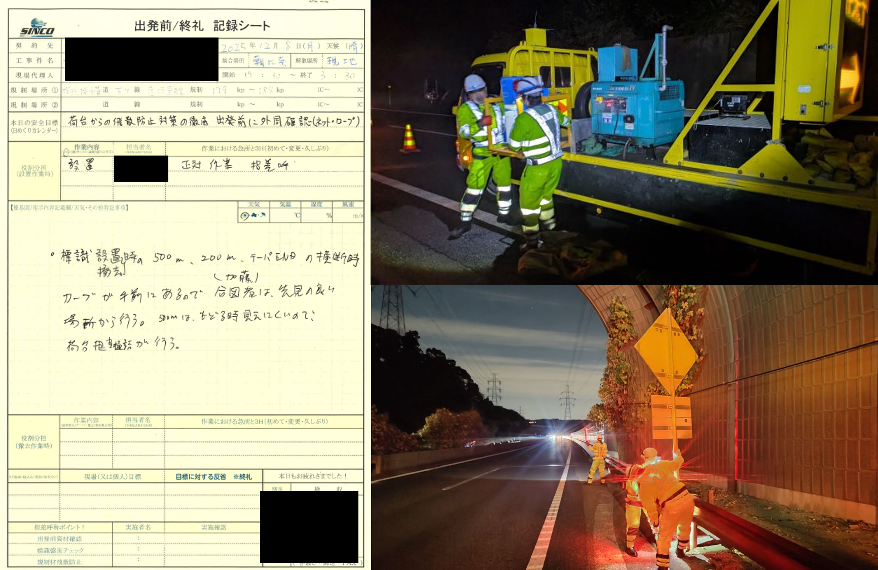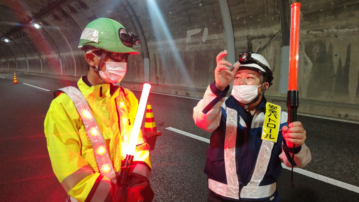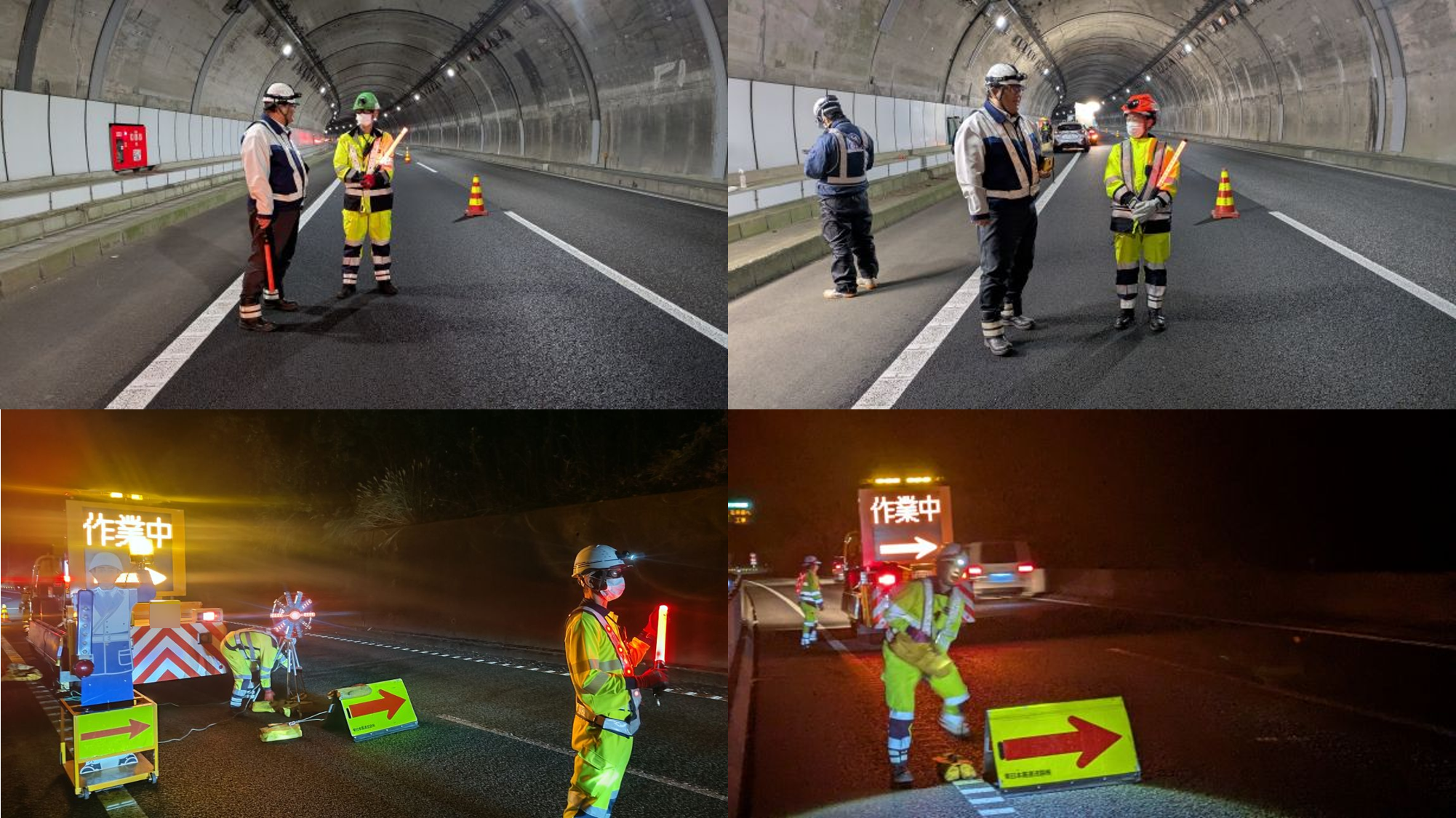 ブリーフィング内容 □規制図を元に運転手の任命・作業手順の説明・役割分担配置決め □監視員の任命 □寒さで体が強張っているので作業前に軽く体をほぐす運動をする □乗車前P券の確認を徹底所感 ・労働災害腰痛防止・重量物複数人での対応 ・飛散防止について ・正対作業の実施・突っ込まれ防止・逃げ場の確保 ・保護具の着用 を重点項目として設置パトロールを営業所長大竹・安全室船橋で実施致しました。 【規制設置環境】 ・規制は横浜横須賀道路下り線の東逗子トンネルの手前の、 見通しの良い直線部分から仮テーパー テーパー部を設置一般車からの視認性は良好でした。 ・路肩には落ち葉や枯草があり火災になる要因が多い場所での発炎筒の使用となり、 可燃物を避けて設置する必要がある環境でした。 【協議通りの規制】 ・標識車へ同乗し規制設置の手順を確認しましたが、 こちらは手順どおりの動きをしていた為、不安全な箇所はありませんでした。 ■重点項目 【労働災害腰痛防止・重量物複数人での対応】 重量物(安全太郎)は2名で対応しており怪我も無く問題ありませんでした。 【飛散防止について】 テーパー部がGRの無い場所(法面・橋梁)でしたのでウェイトを使用した 当社規定の飛散養生を実施しておりました。 立て看板類は資材車後部にロープにて二重で固縛しておりました。 【正対作業の実施・突っ込まれ防止・逃げ場の確保】 テーパー設置員は問題なかったのですが、仮テーパー設置員が発炎筒の設置の際、 一般車の動向を注視せず路面ばかりを見ていたのでその場で注意指導し是正しました。 【保護具の着用】 夜間現場につき全員の光物装備品を確認したところ一人の隊員が 夜光チョッキを忘れて現場まで来てしまった事が判明。 パトロール車輛に予備がありましたのでそちらで対応しました。 また他隊員も誘導灯が暗い、チョッキのLEDが暗い等 ありましたので、全て電池交換で対応しました。 チョッキを忘れた隊員については、商売道具を忘れるのはプロ失格であり、 自分の身を守る保護具の重要性をもっと強く意識するように指導を行いました。 今回の不安全行動・装備品への意識の欠落は全て新人隊員によるものですので、 12/25に予定されている安全大会の前後に新人会を開催し現在の規制に対する 知識・安全意識についての聴取が必要と感じました。 この現場は新人隊員の教育の場となっているので隊長へは もっと新人隊員へ気を配るように指導を行いました。
