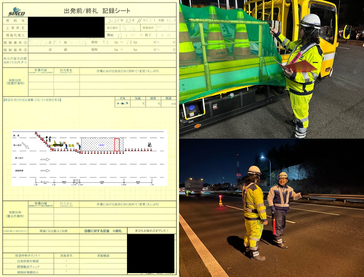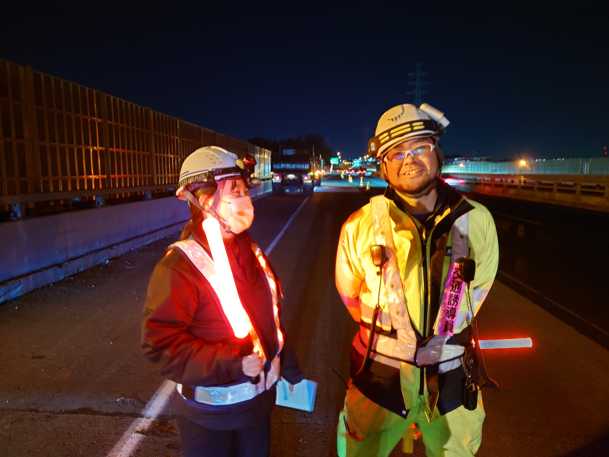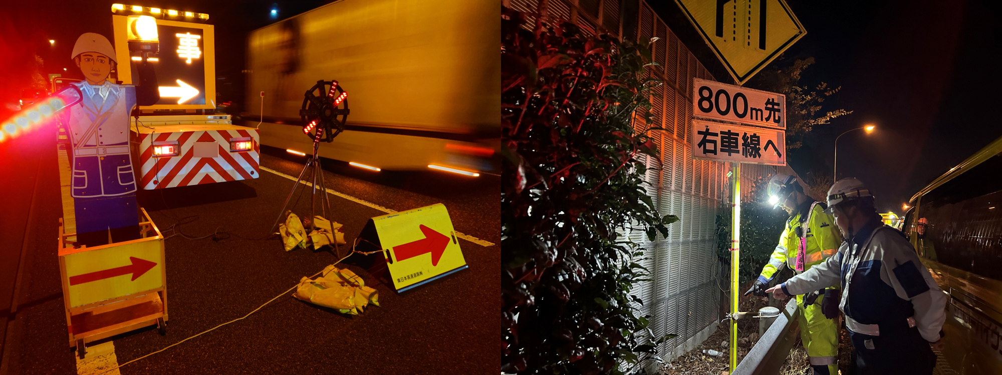 延伸部のコーンが曲がっている場合に修正を行ったり、デリネーターの向きを一般車両に見えるように