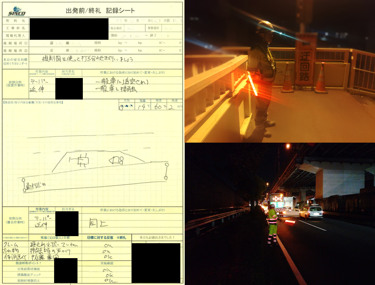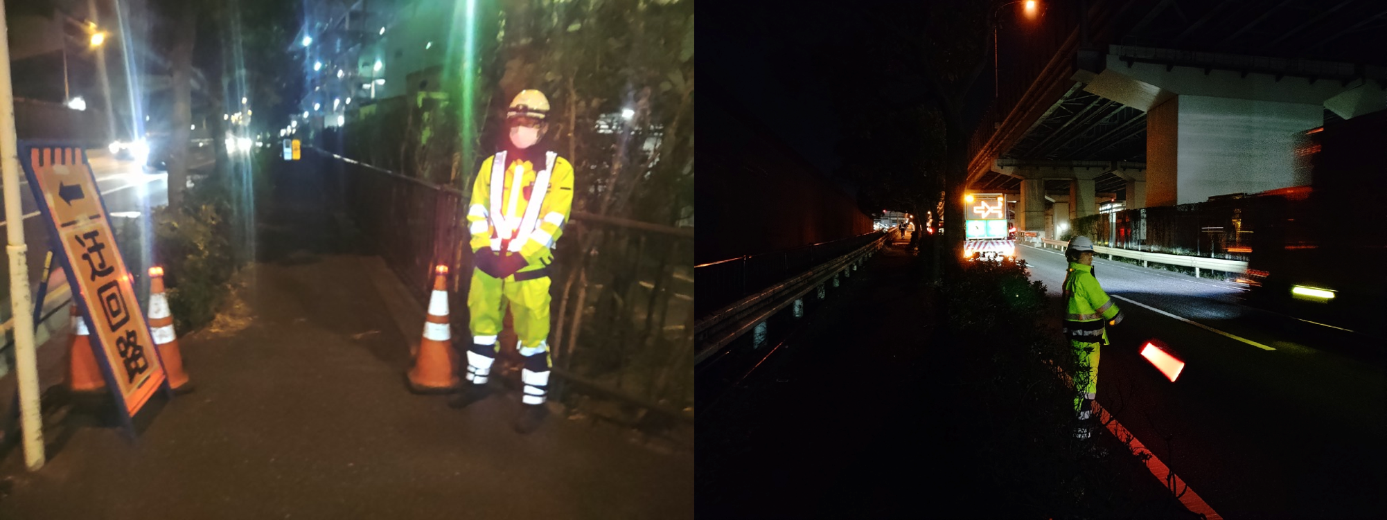 規制開始時間で車線規制側の歩道通行止め班は規制と合同で動いてたため問題なかったが、