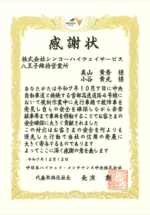 中日本ハイウェイ・メンテナンス中央株式会社様より感謝状を頂戴しました