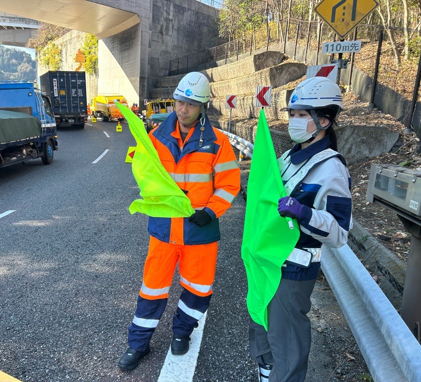 カーブが急な合流箇所での作業でしたが、監視員を適切に配置し、