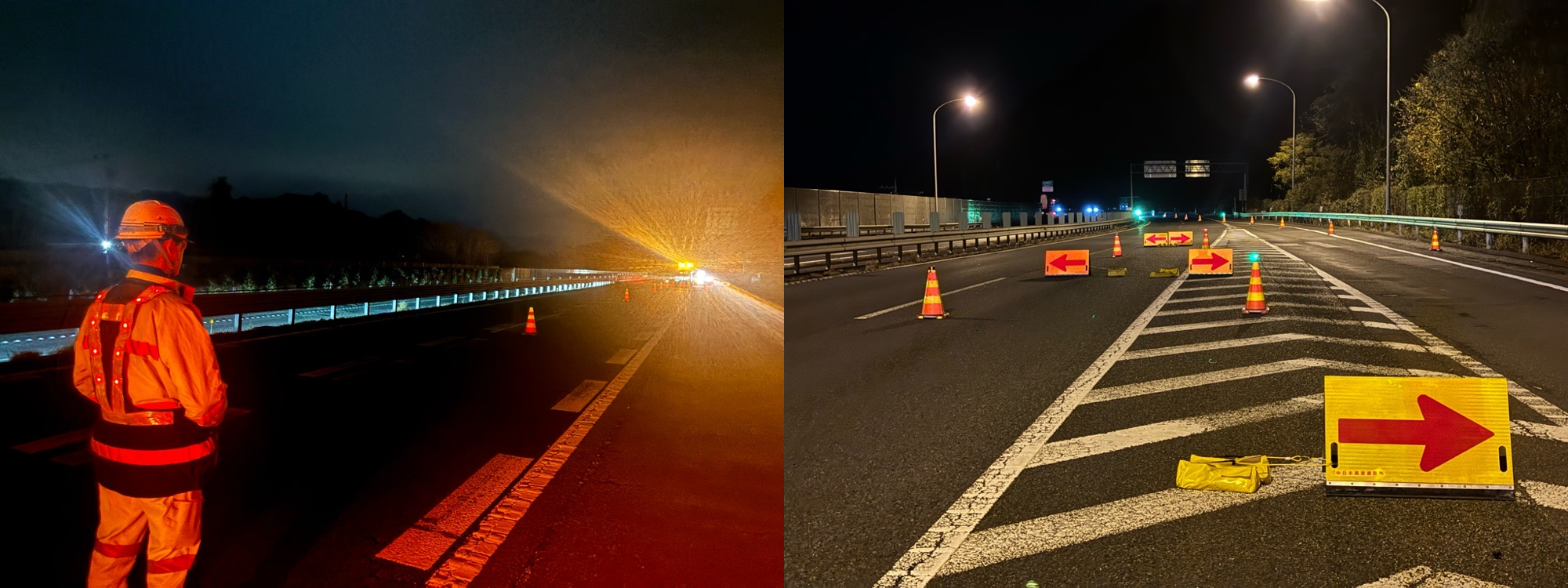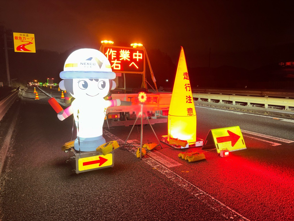 ・規制資材(コーン・矢印板・看板)の配置が概ね整っており、夜間でも十分な視認性を確保できていた。