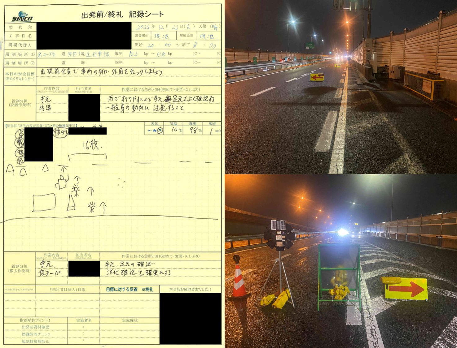資材車、車載車、防護車の3台が息をそろえて規制設置を行わなければならないため、