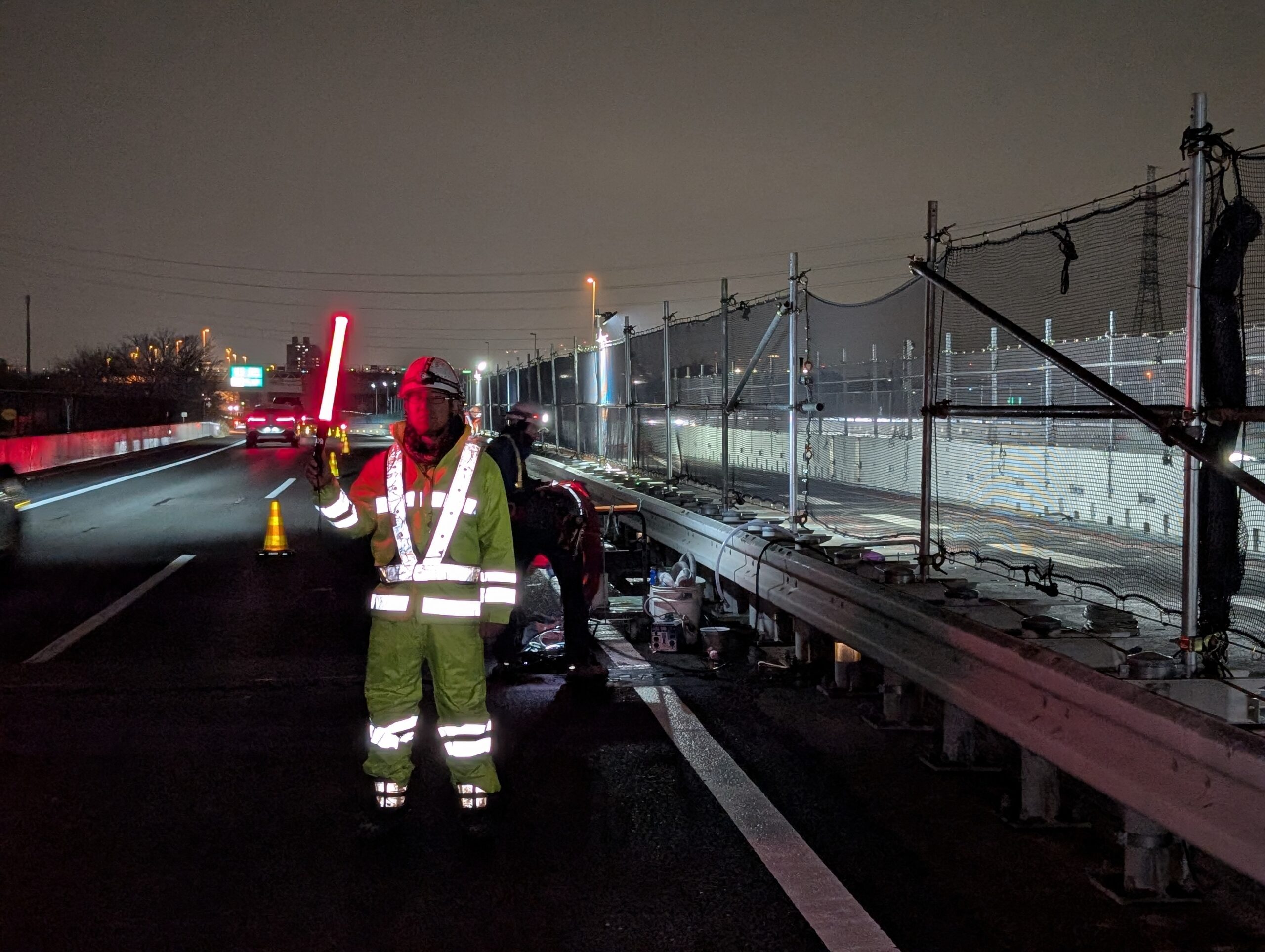 東名阪自動車道下り線におけるリニューアル工事を固定規制内での行っております。