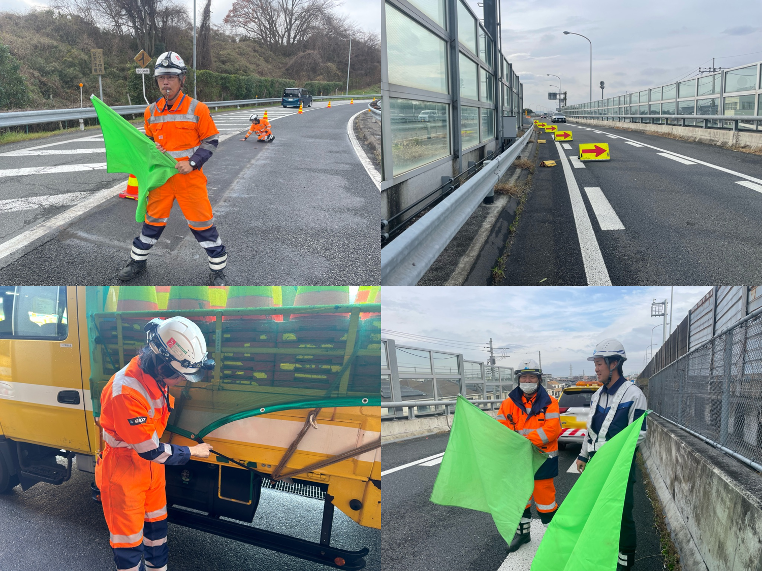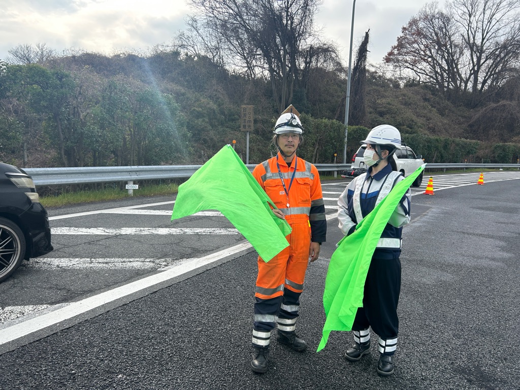 ランプ規制で通行車両が多い状況の中、作業員および通行車両の動きに細心の注意を払い、