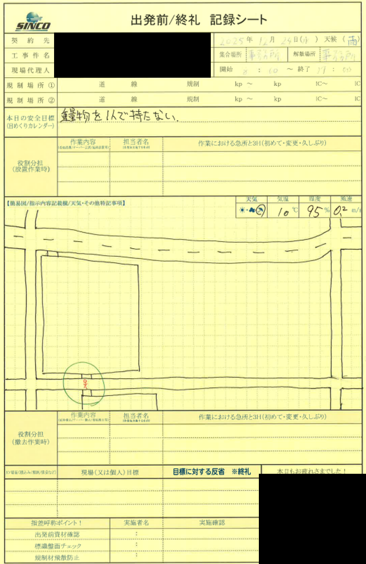 安全パトロール(飯田営業所)ブリーフィング内容 本日の保安・誘導箇所 先方作業内容 それに伴う工事車両の流出入状況 注意点・質疑応答